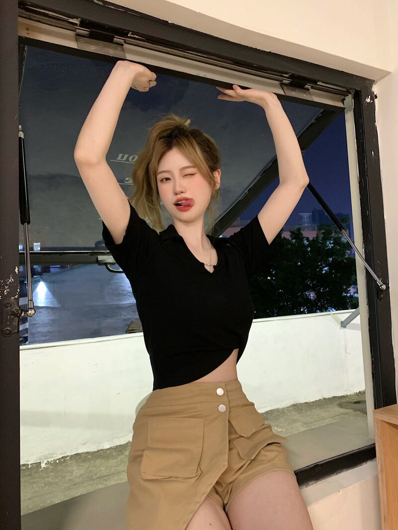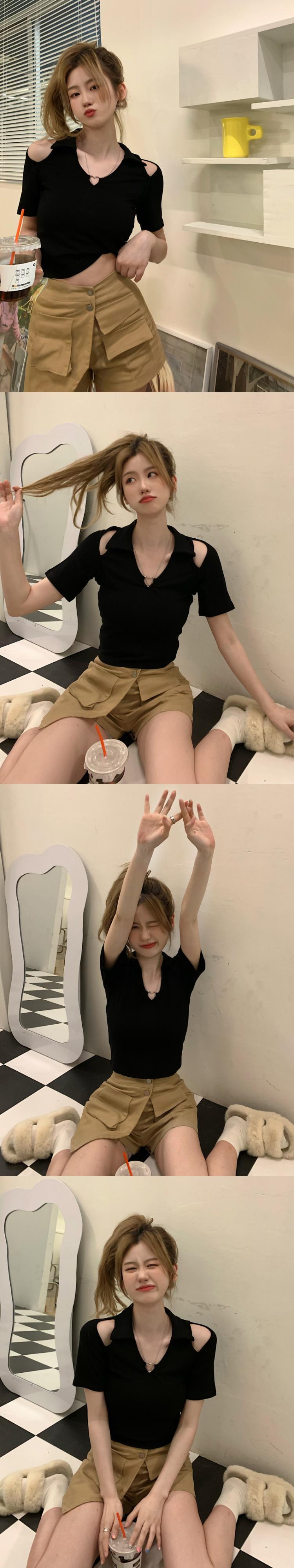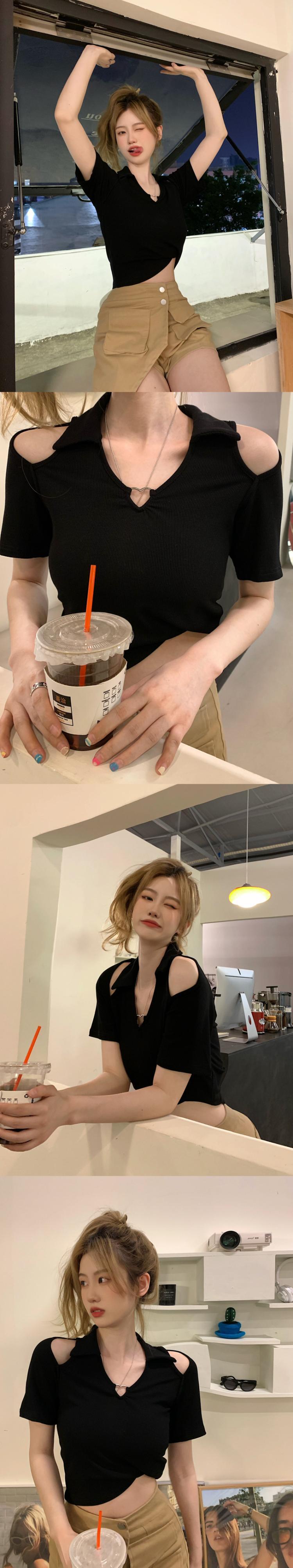 ブラックトップの女性の2022年夏の新しいbmスタイルのデザインセンスショートくり抜かれたオフショルダー半袖VネックTシャツ サマー 夏物 7460050632483911 | framboise21