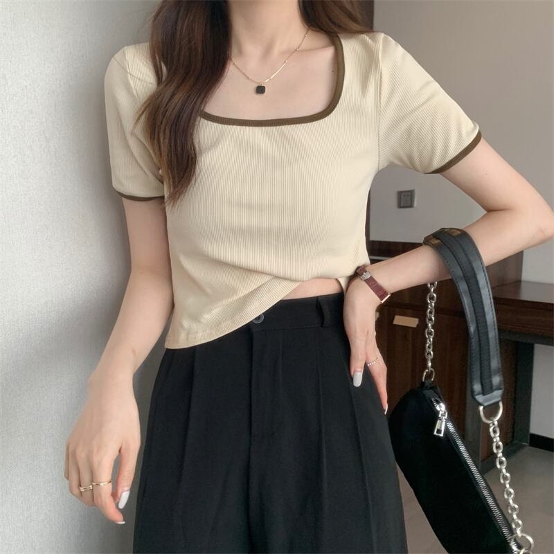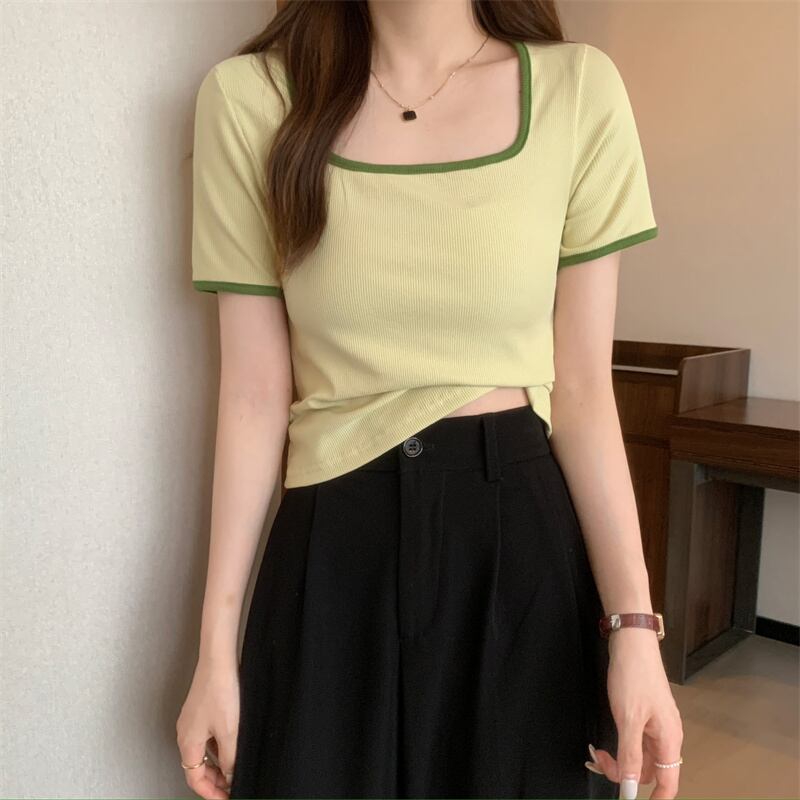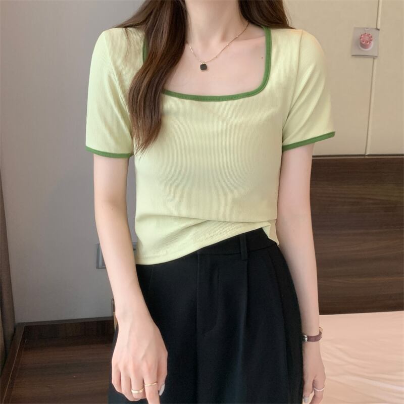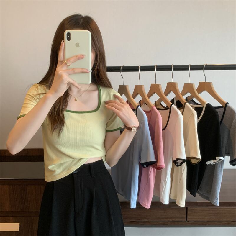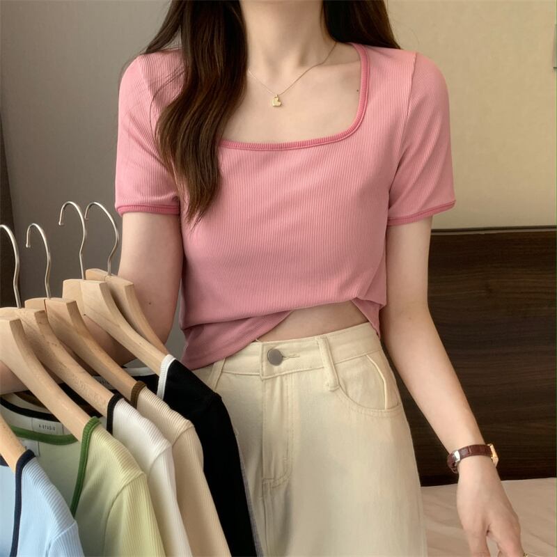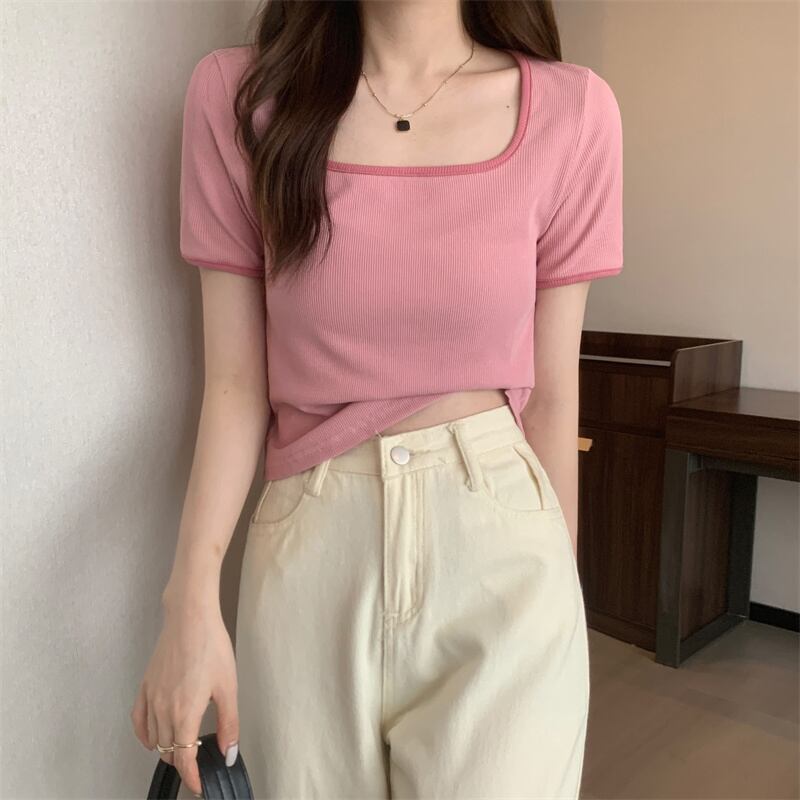 ピンクのフロントショルダーTシャツレディース夏2022新しいbm甘いデザインスリム半袖スクエアカラートップ ショート ハーフスリーブ 大人ガーリー スウィート キュート カジュアル サマー 夏物 スクウェア 7460087881144695 | framboise21