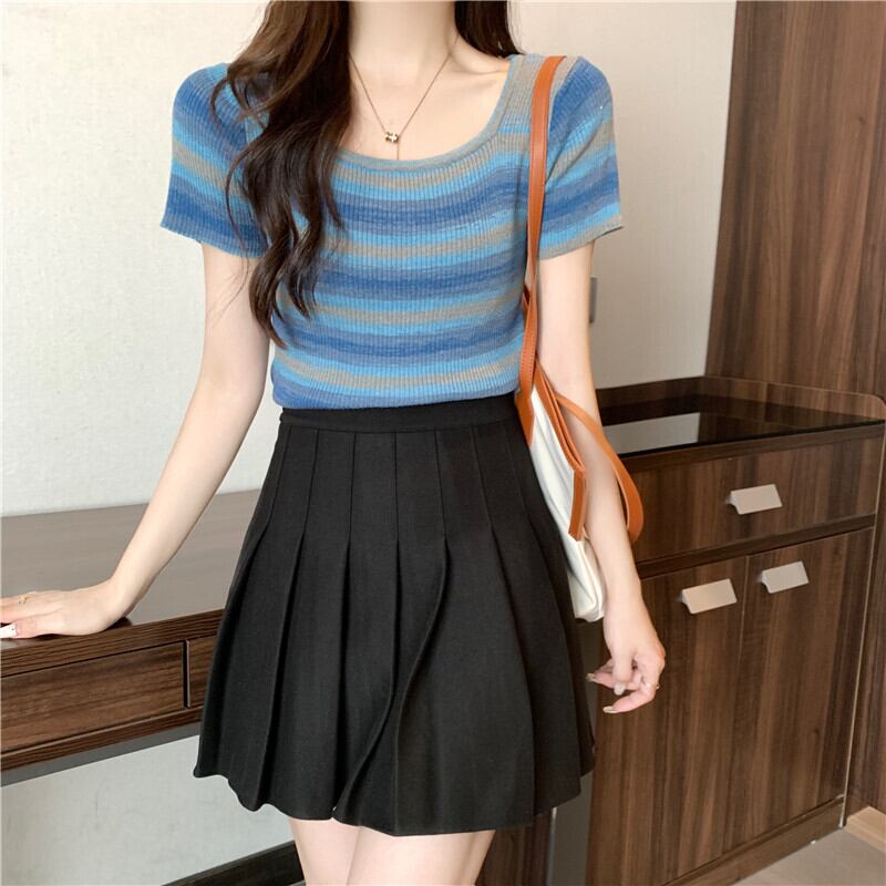 シックなコントラストカラーのスクエアネックストライプアイスシルクニット半袖Tシャツレディースサマースリムフロントショルダーファッションショートトップ 夏物 スクウェア 7460032609859518 | framboise21