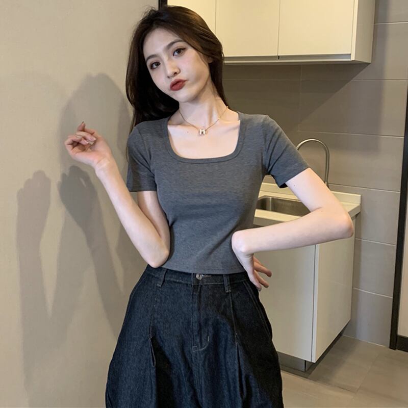 2022年夏の新作流行のスクエアネックショートトップスにニッチ感のあるハイエンドフロントショルダー半袖Tシャツ女性 サマー 夏物 スクウェア 7460060679362124 | framboise21