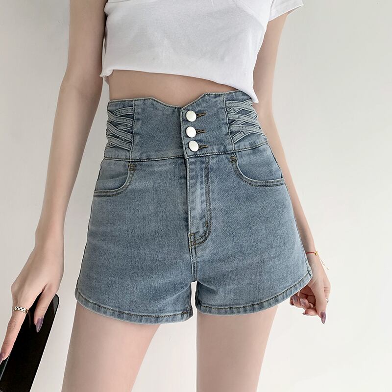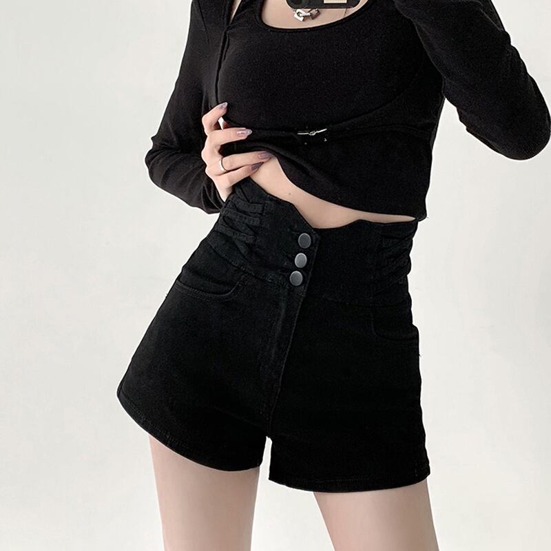 黒のハイウエストデニムショーツ女性の2022年夏の新しいデザインのaラインスーパーショーツ薄いパンツ ハイウェスト ブラック サマー 夏物 ブルマー 7460073975541015 | framboise21