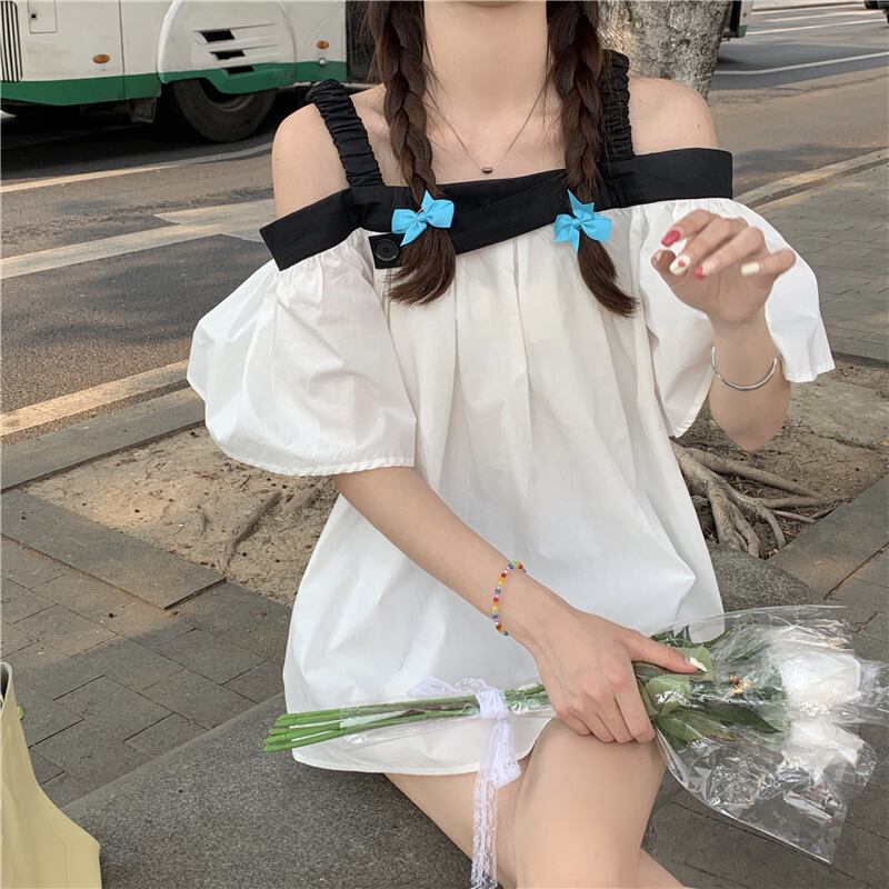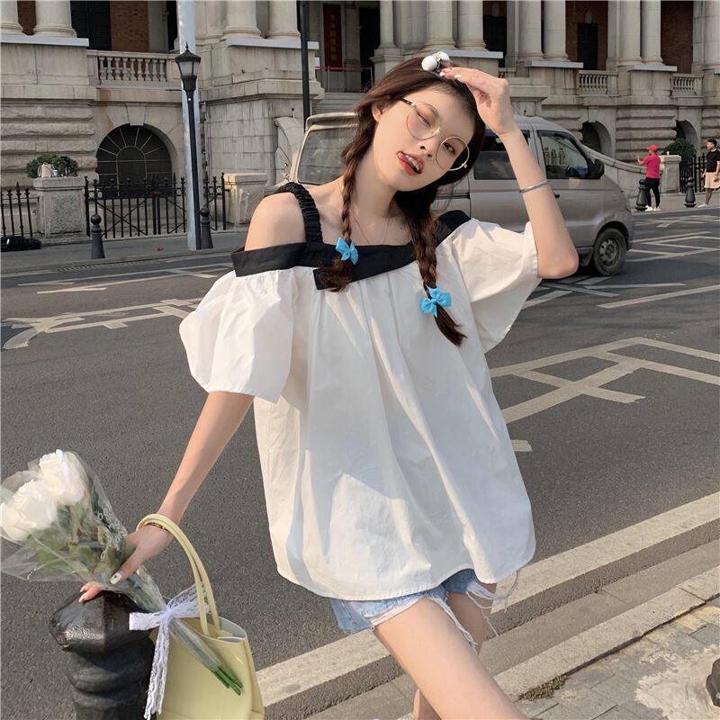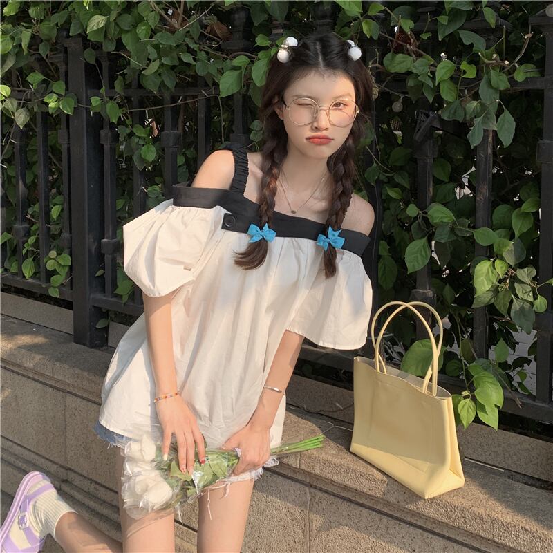 ハイエンドワンワードカラーストラップレスシャツレディースサマーコントラストカラーカジュアルルーズドールシャツミドル丈トップのバージョン 夏物 7460016377063390 | framboise21