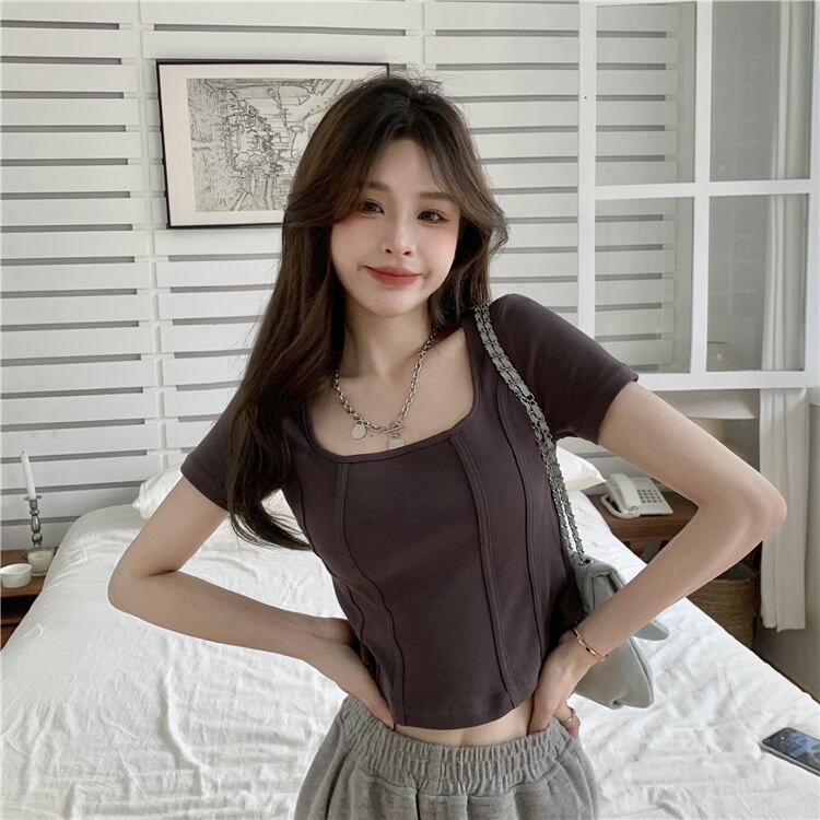 ピュアデザイアスタイルスクエアカラーホワイト半袖Tシャツレディースサマースリムフィット鎖骨ショルダーハイウエストショートトップ ハイウェスト 夏物 スクウェア 7460014955155947 | framboise21