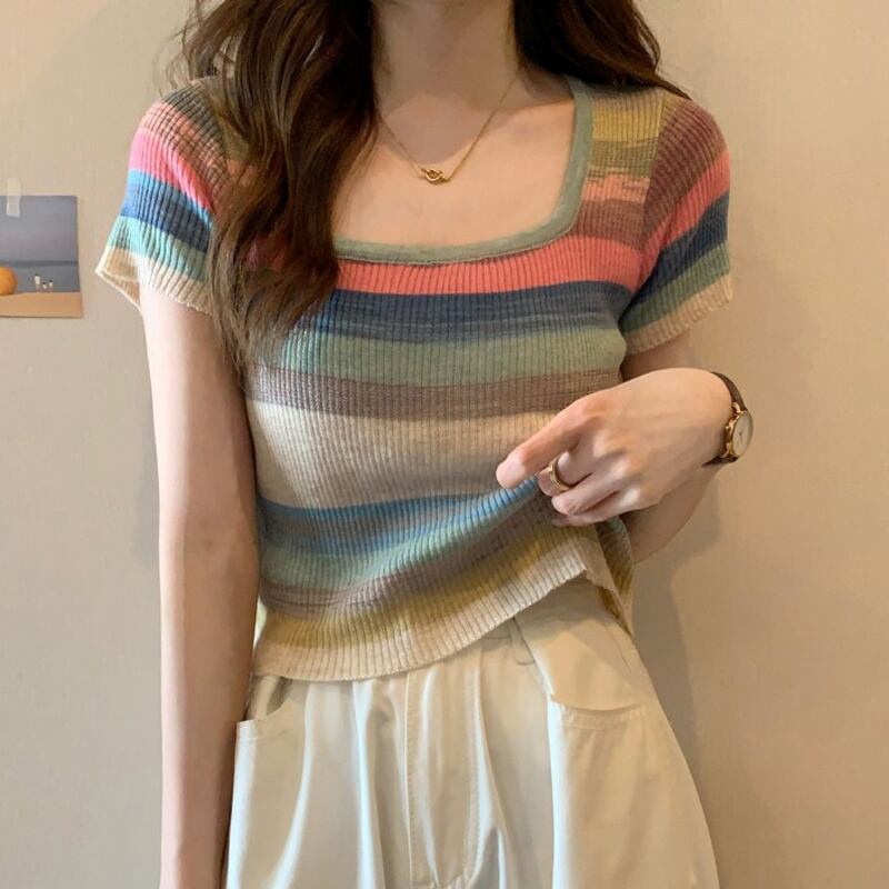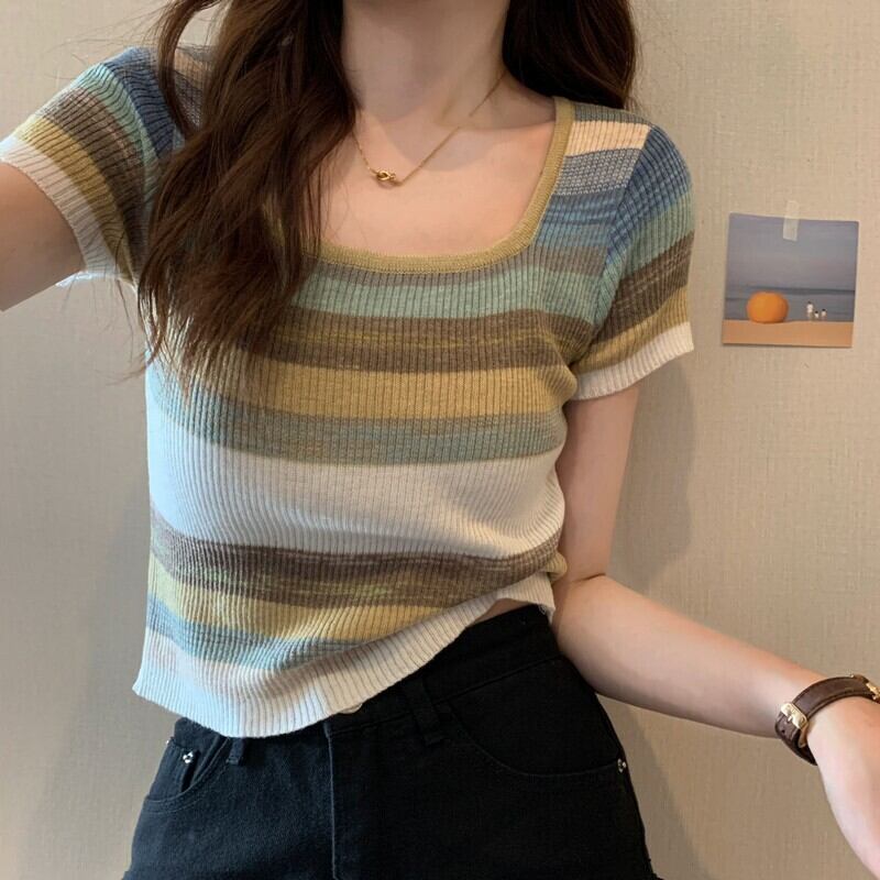 ストライプTシャツ女性の2022年夏新しいスリムニット半袖トップボトミングショートスクエアカラースモールシャツデザインセンス サマー 夏物 スクウェア 7460092965510846 | framboise21
