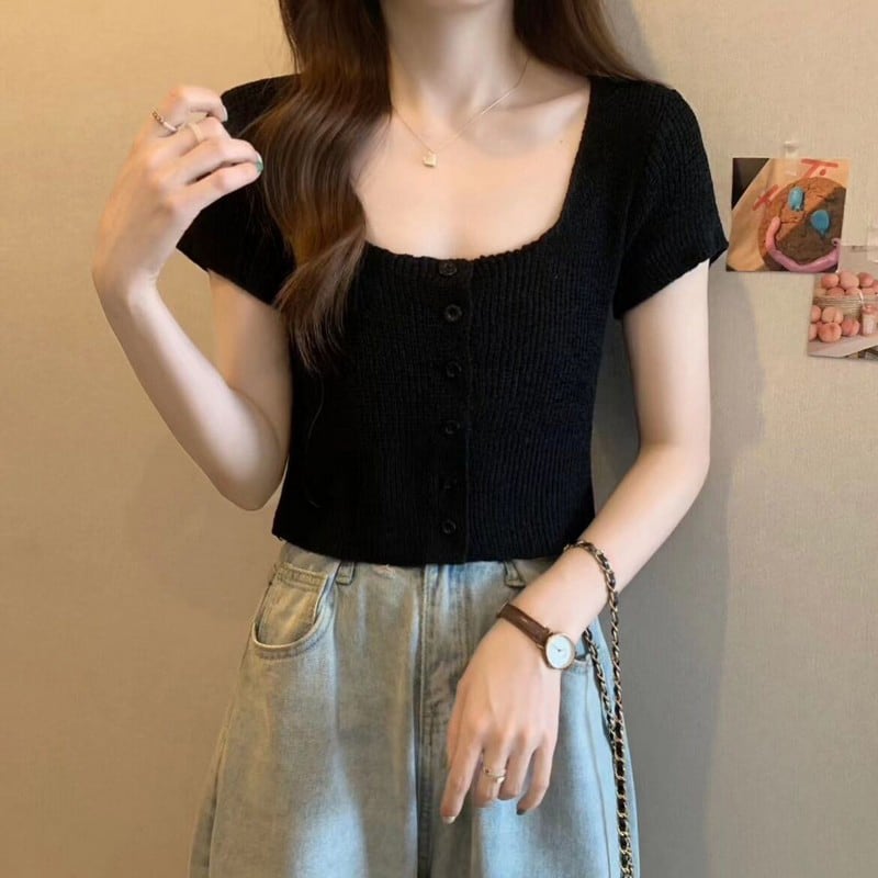 ブラックスクエアネック半袖Tシャツレディースサマーデザインニッチハイエンドショートフロントショルダーシャツスリムシントップ 夏物 スクウェア 7460096221405884 | framboise21