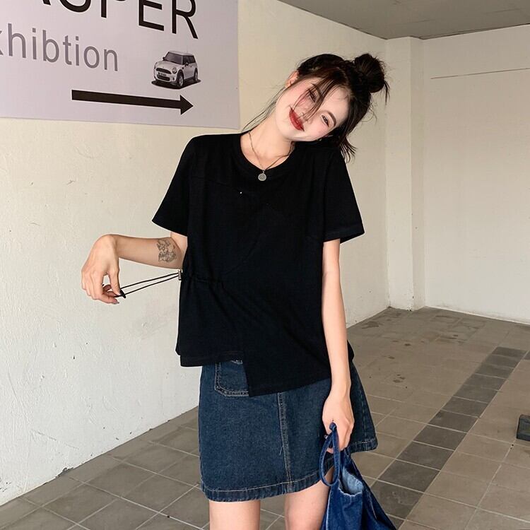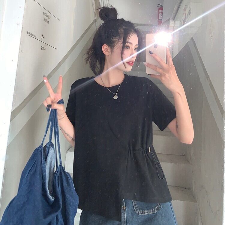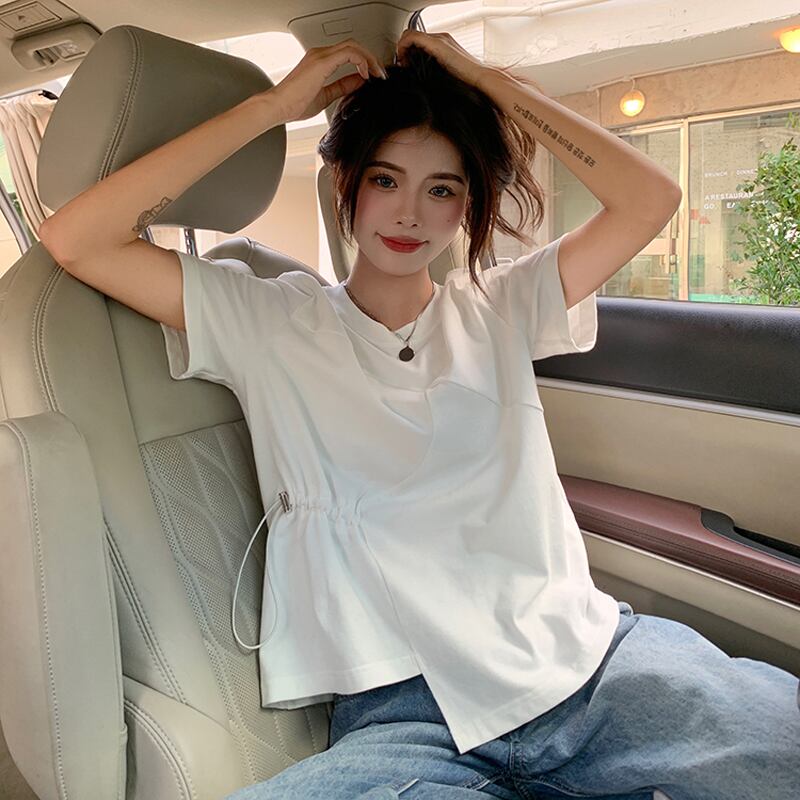 不規則なデザインセンス巾着ルーズホワイト半袖Tシャツレディースサマーイントレンディファッションウエスタンスタイルニッチユニークトップ 夏物 7460074230821556 | framboise21