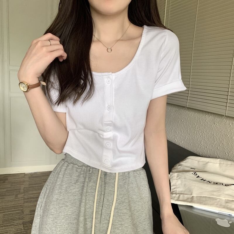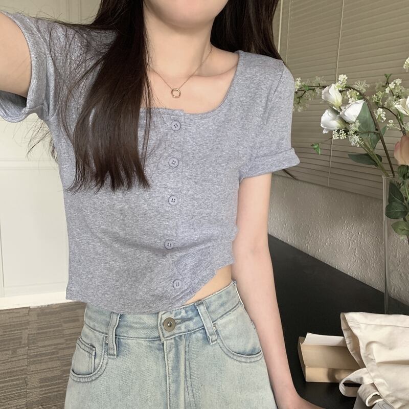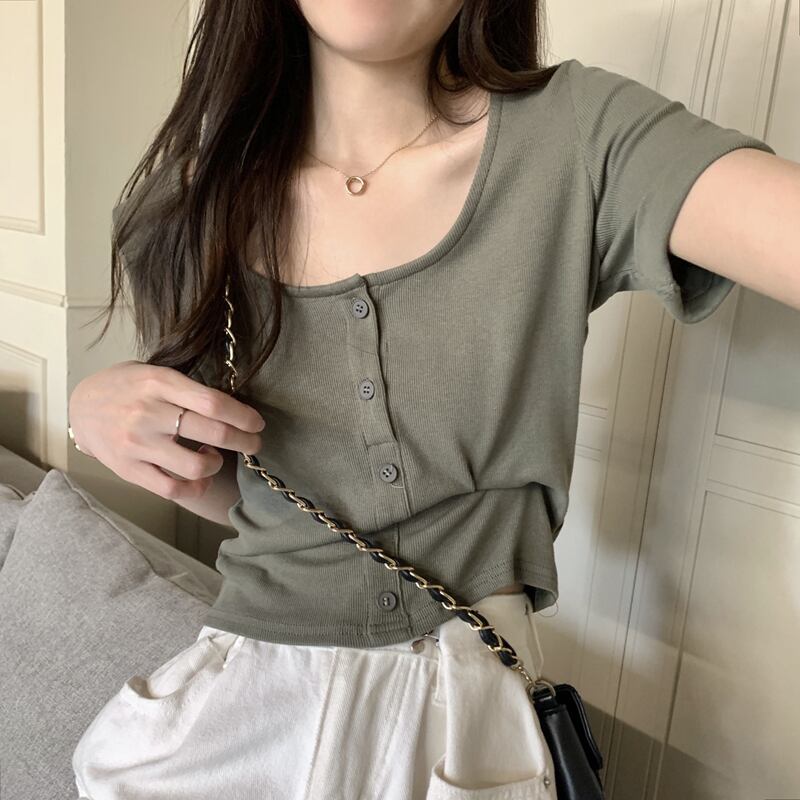 グリーンアイスシルクラージネックラインフロントショルダー半袖TシャツレディースサマーデザインニッチショートスクエアネックトップTシャツサマー 夏物 スクウェア 7460055241963979 | framboise21