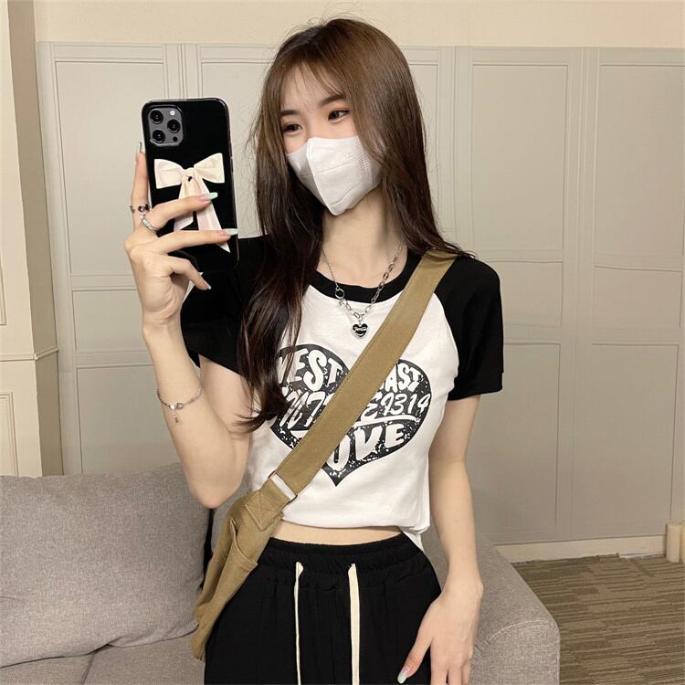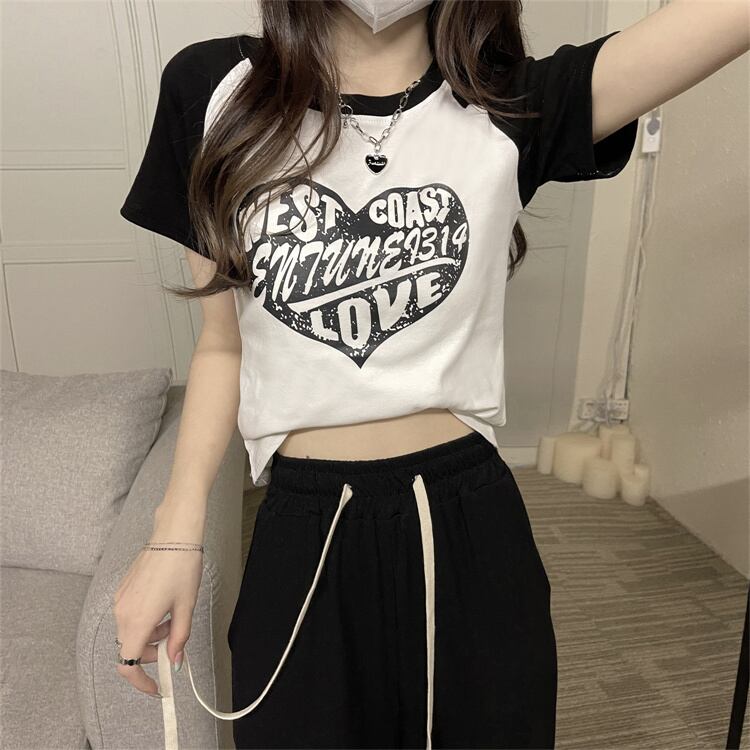 甘くてかっこいいbmスタイルのコントラストカラーラグランラブプリント半袖Tシャツレディースサマースモールトールウエストショートスリムトップ 大人ガーリー スウィート キュート カジュアル 夏物 746002474098252 | framboise21
