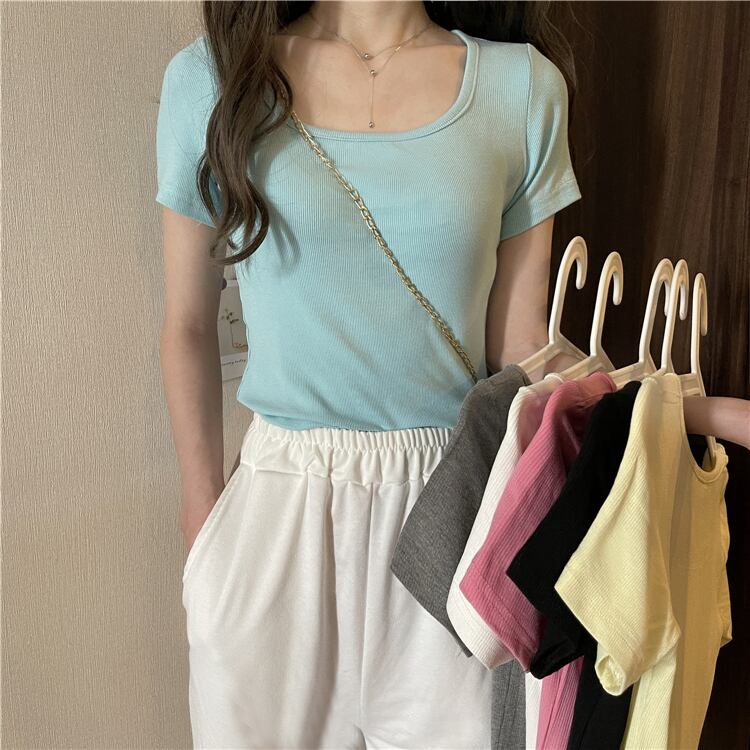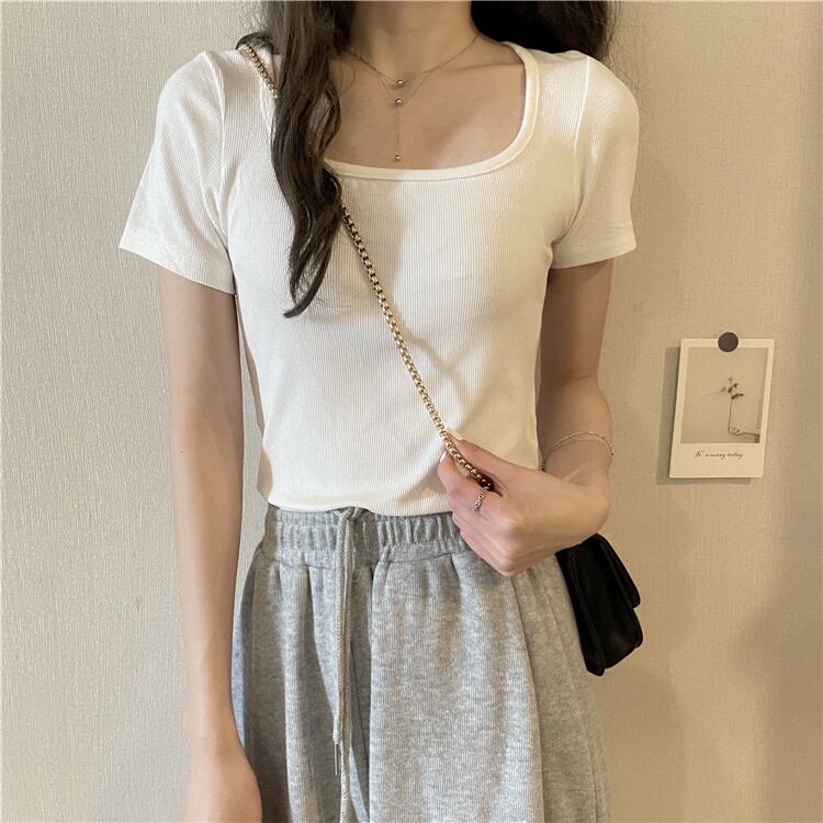グレーのスレッドコットンスクエアカラー露出カラーボーン半袖Tシャツレディースサマーニュースリムショートトップ、ハイウエストパンツ ハイウェスト 夏物 スクウェア 7460057582467884 | framboise21