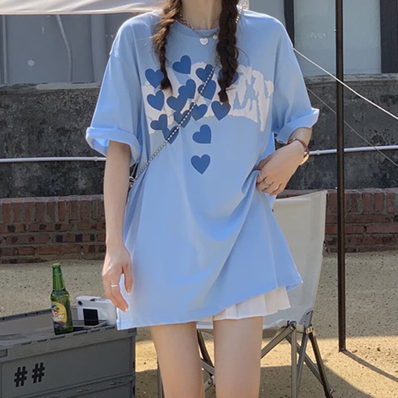 ボトムスミッシングラブコットン半袖TシャツレディースイントレンディなデザインセンスニッチミディアムとロングルーズトップスTシャツ夏 サマー 夏物 74600884862053 | framboise21