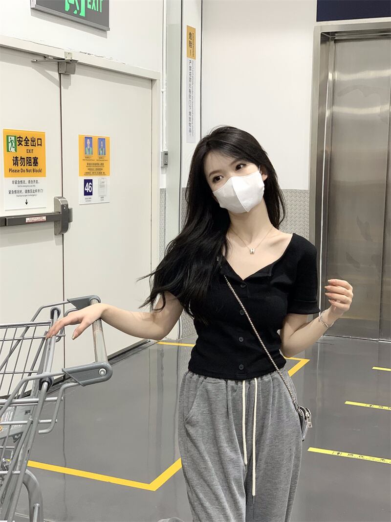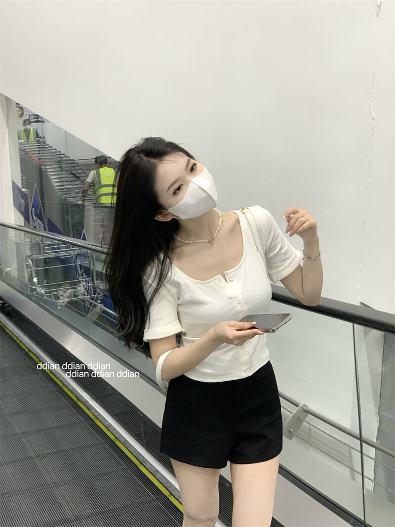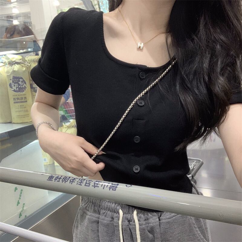 ブラックスクエアネックフロントショルダー半袖Tシャツレディースサマーデザインニッチ薄片ハイウエストスリムフィットスモールTシャツトップ 夏物 スクウェア 7460051017212239 | framboise21
