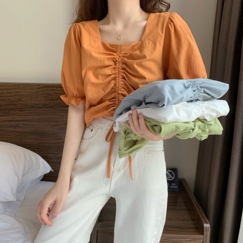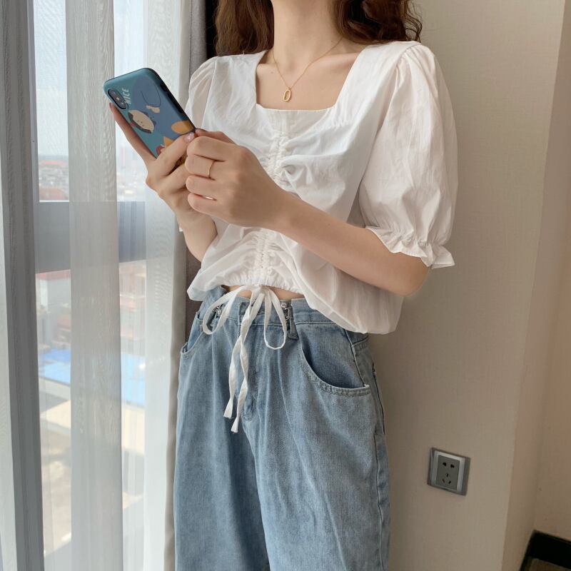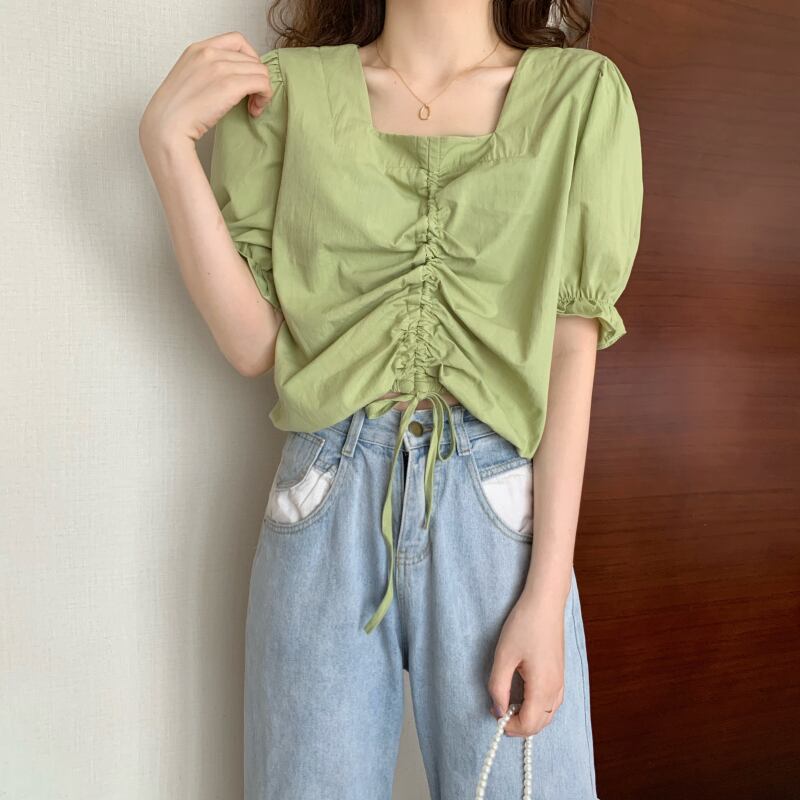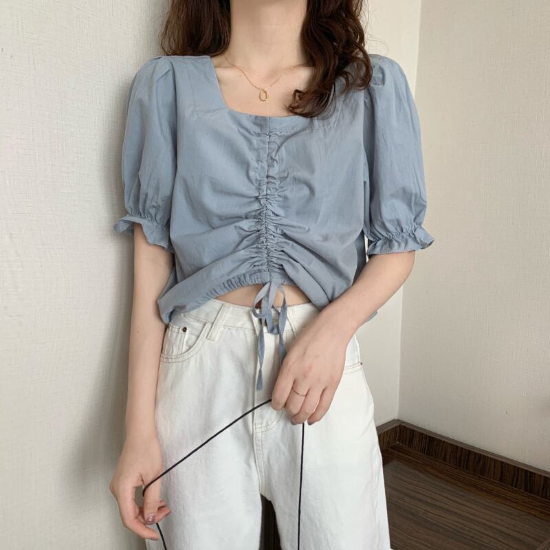 夏の新デザインセンススクエアネック巾着バブル半袖フロントショルダーTシャツレディースショートエインスタイルカードウエストスモールシャツトップ サマー 夏物 スクウェア 7460047606072379 | framboise21