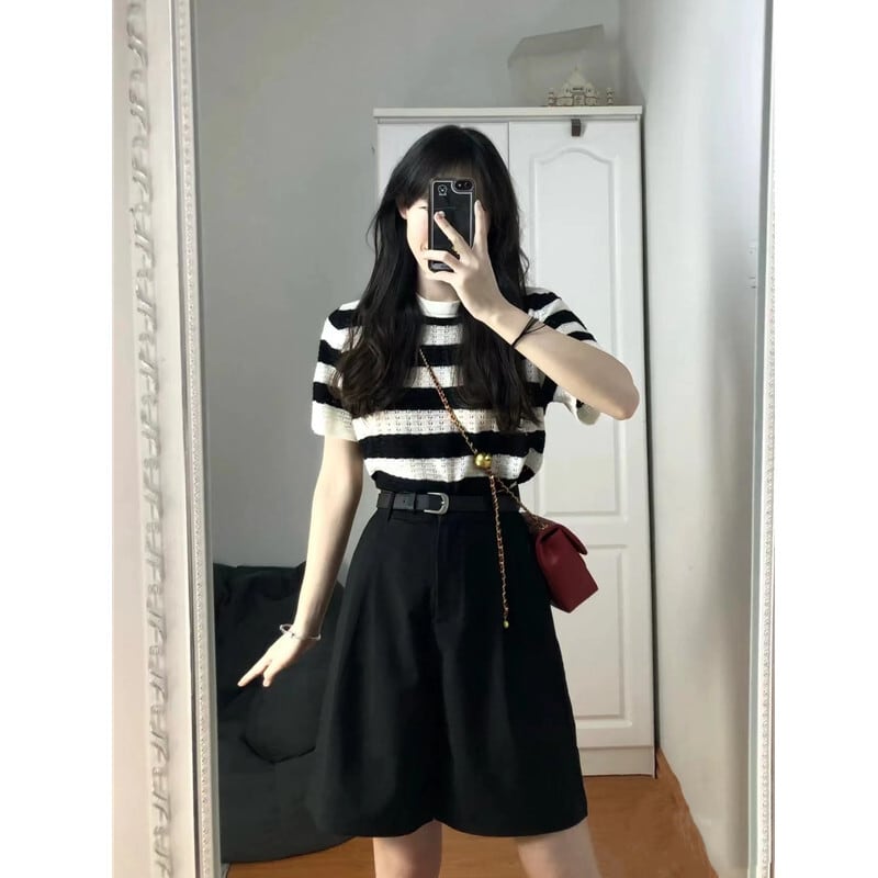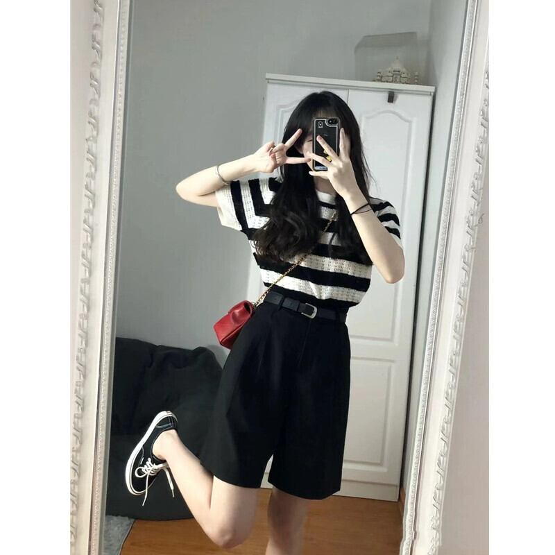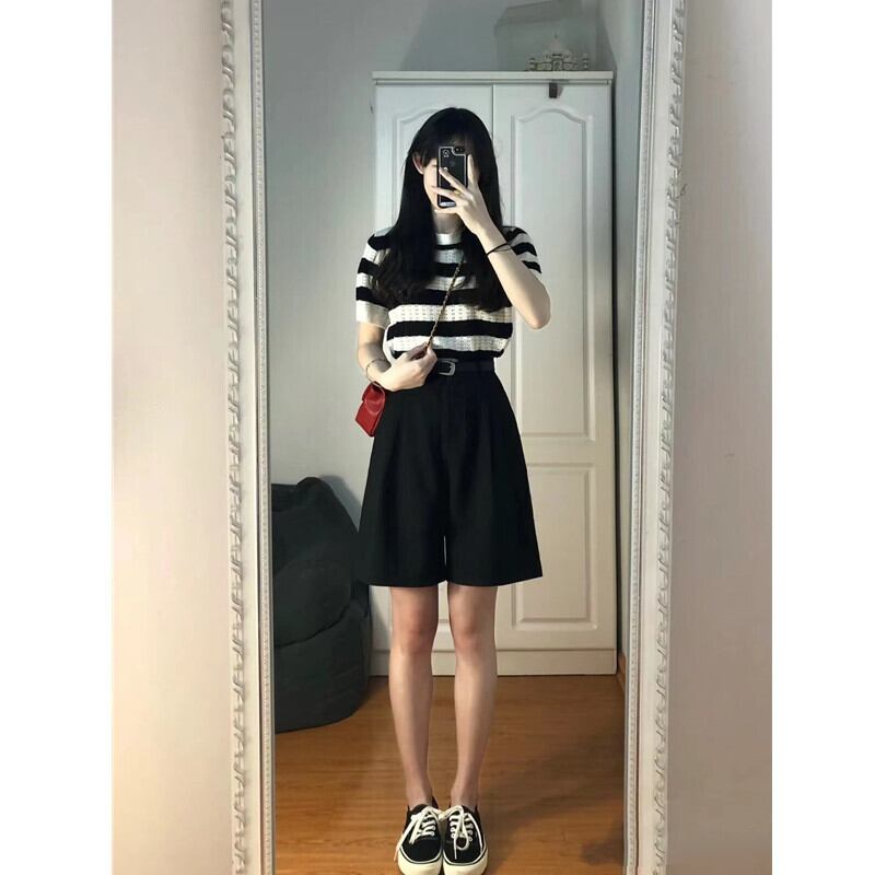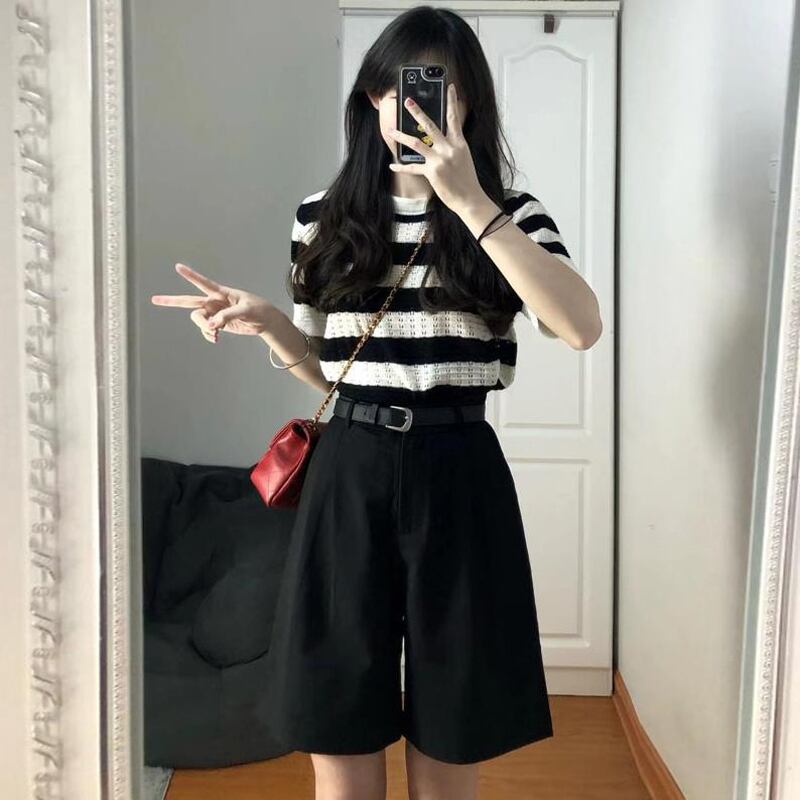 黒のスーツショーツ女性の2022年夏新しい小さなルーズワイドレッグハイウエストカジュアル薄い5ポイントパンツ ハイウェスト ブラック サマー 夏物 ブルマー ワイドパンツ 7460014120386806 | framboise21