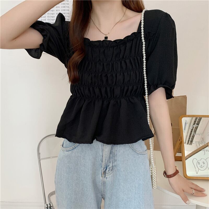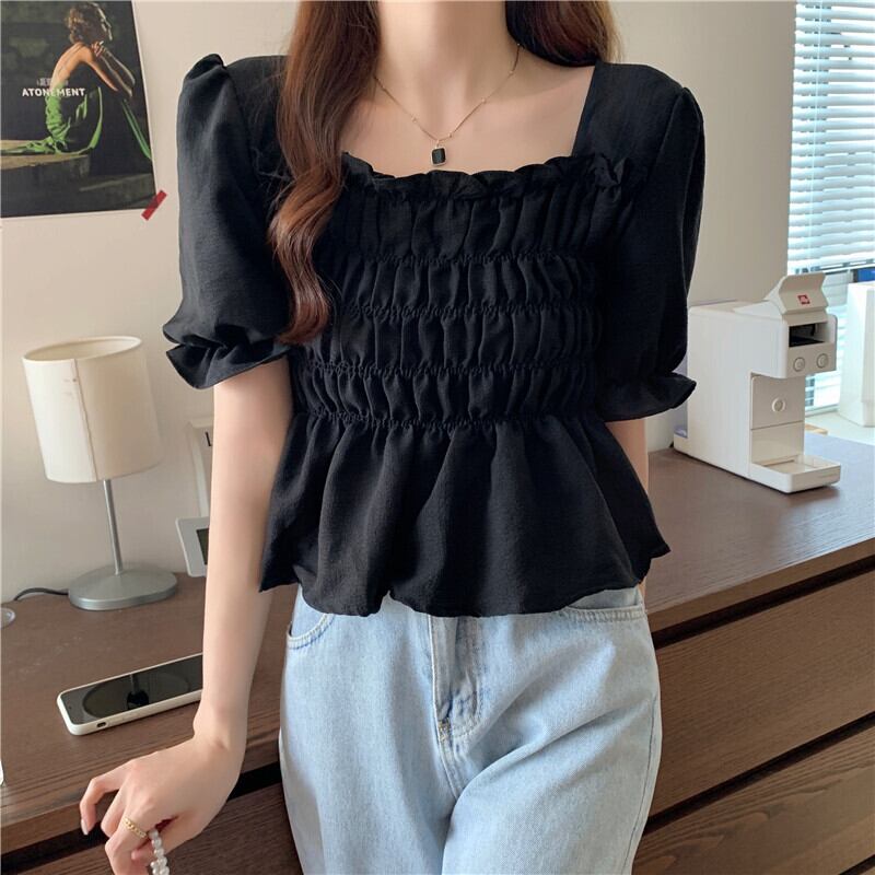 黒のパフスリーブスクエアネックシフォンシャツ女性の美しい小さなシャツウエストスカートショートドールシャツ半袖トップ夏 ブラック ハーフスリーブ サマー 夏物 スクウェア 7460030999371353 | framboise21