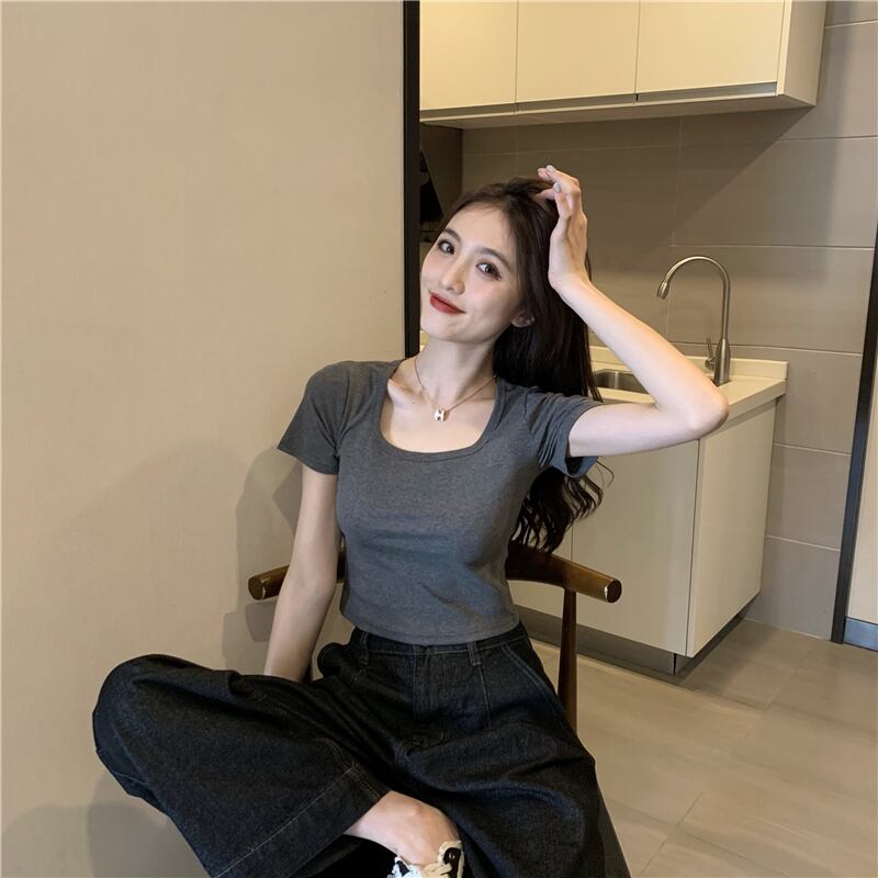 スクエアネッククロップトップショートTシャツレディースサマー半袖ハイウエストネットレッドタイトフィットデザインニッチハーフスリーブインタイド 夏物 スクウェア 7460039125683165 | framboise21