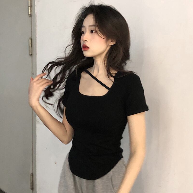 ブラックスクエアカラー鎖骨半袖Tシャツレディースインスティッドサマーセルフカルチャー不規則ピュア欲望ハイウエストショートトップ ハイウェスト 夏物 スクウェア 7460055850564587 | framboise21