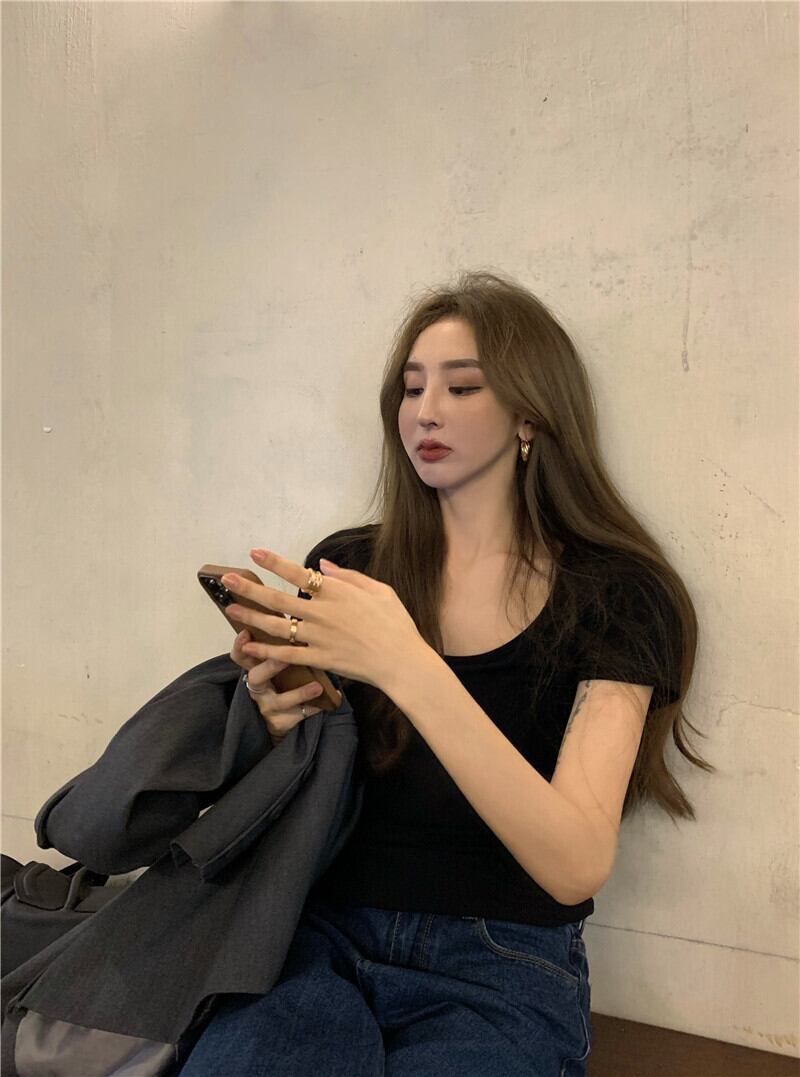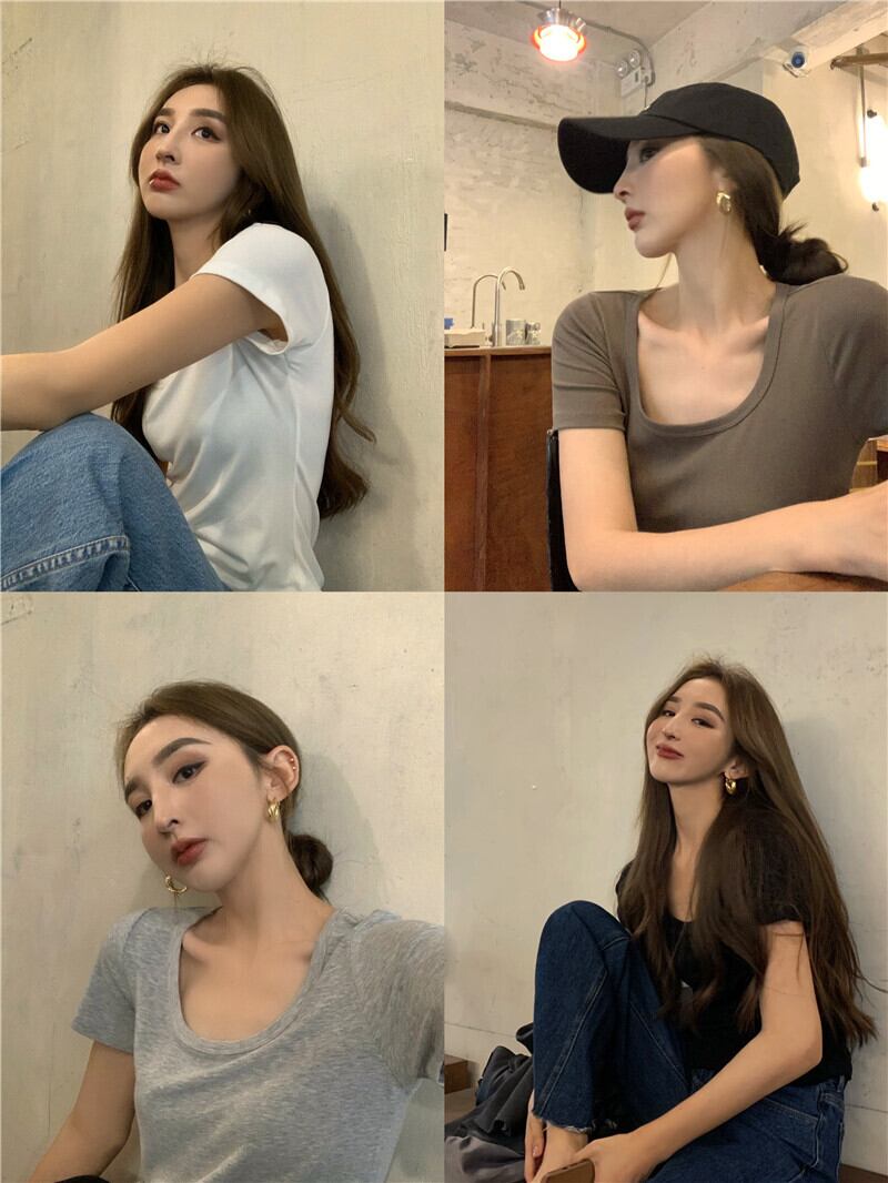 グレーショートフロントショルダーTシャツレディース半袖2022年夏スリムスリム無地スクエアネックトップ ハーフスリーブ サマー 夏物 ソリッドカラー スクウェア 7460010349972597 | framboise21