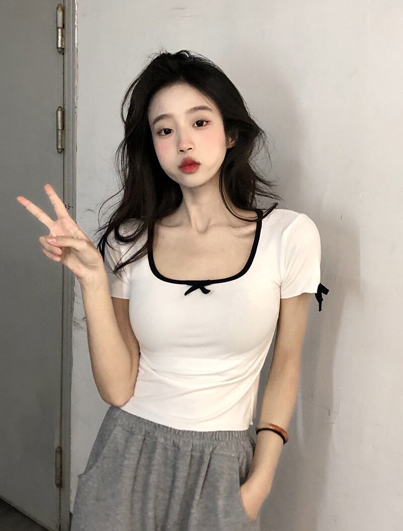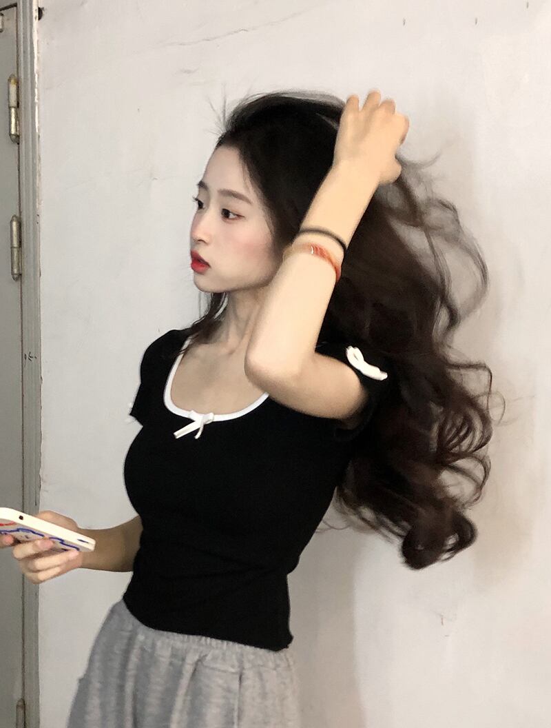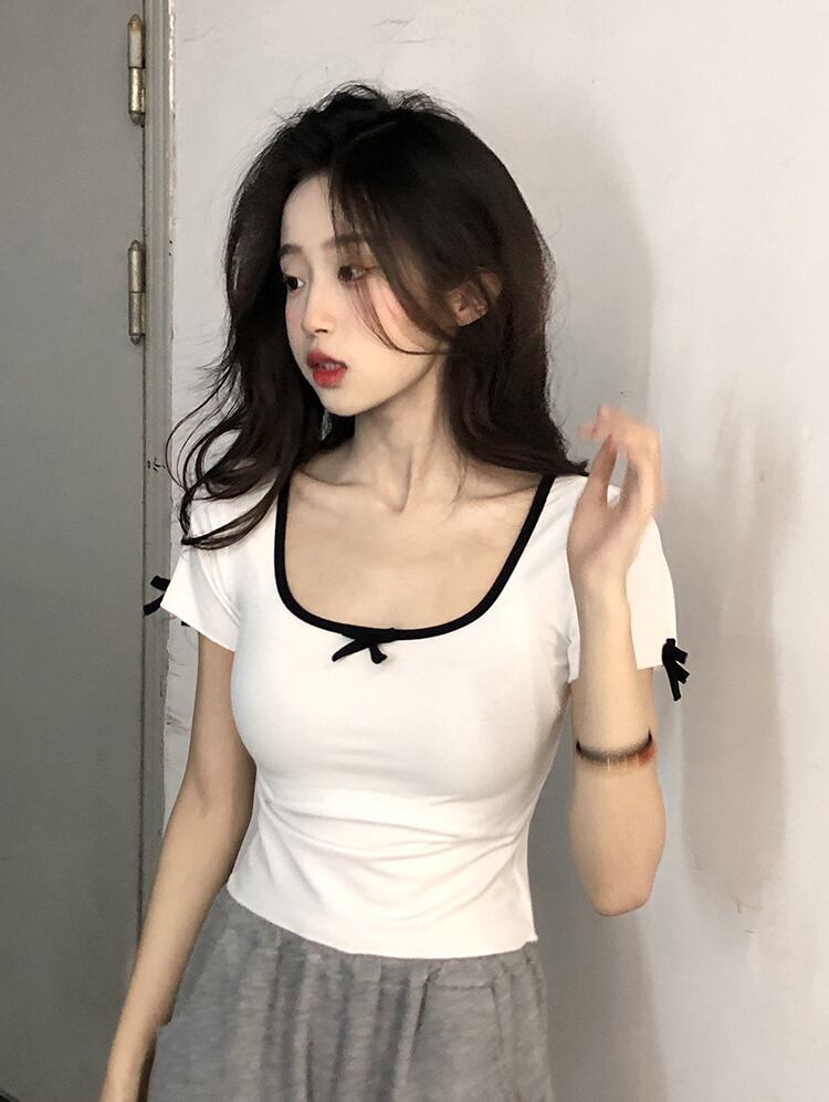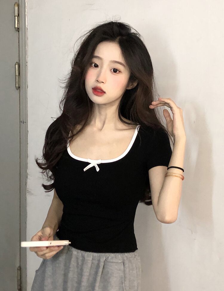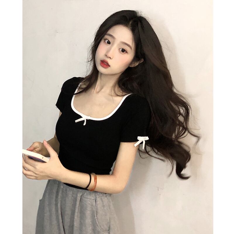 ホットブラックスクエアカラー半袖Tシャツレディースサマーピュアコットンショルダーデザインセンスニッチスリムスリムショートトップ 夏物 スクウェア 7460048670214372 | framboise21