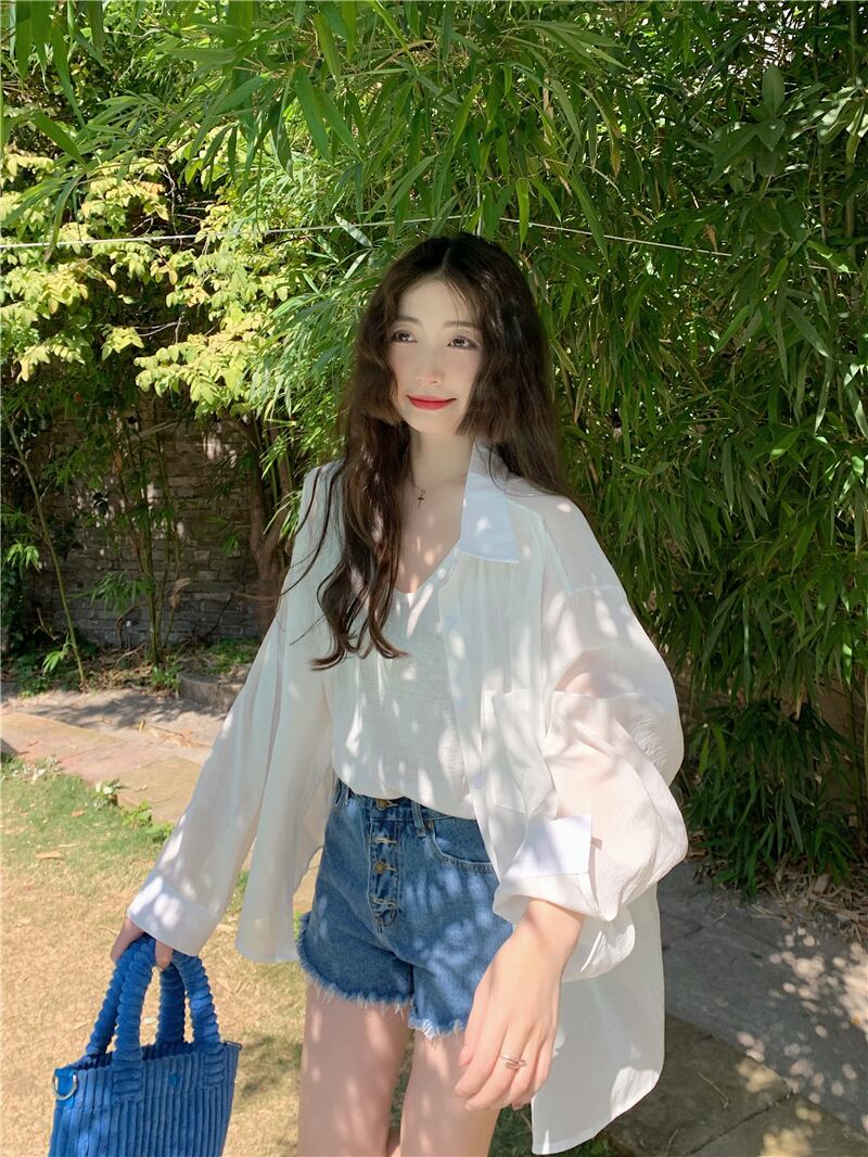 ブルー長袖サンスクリーンアイスシルクシフォンシャツシャツレディースサマー薄手高品質スモールシャツトップコートツーピースセット ロング 夏物 7460050270342884 | framboise21