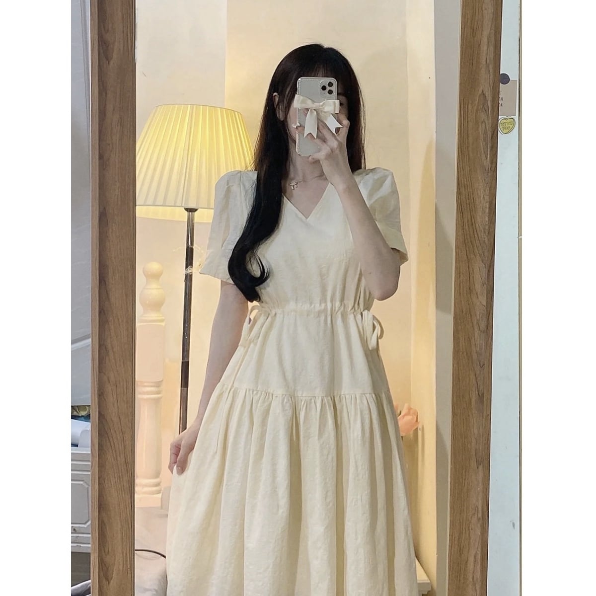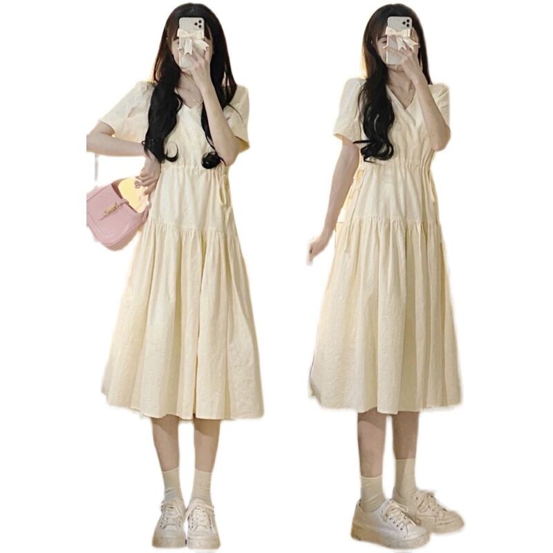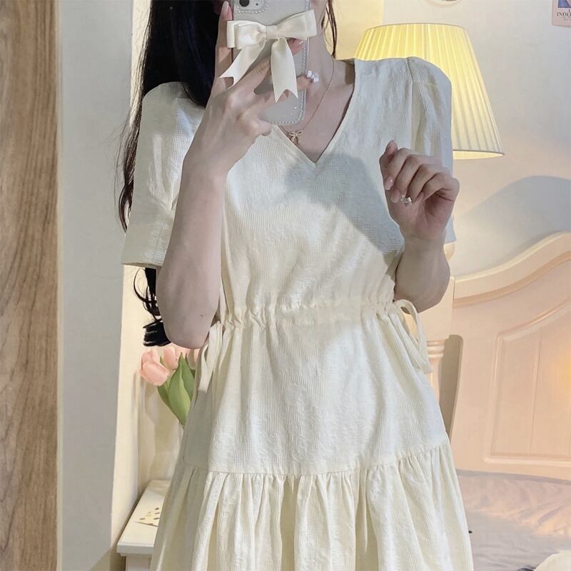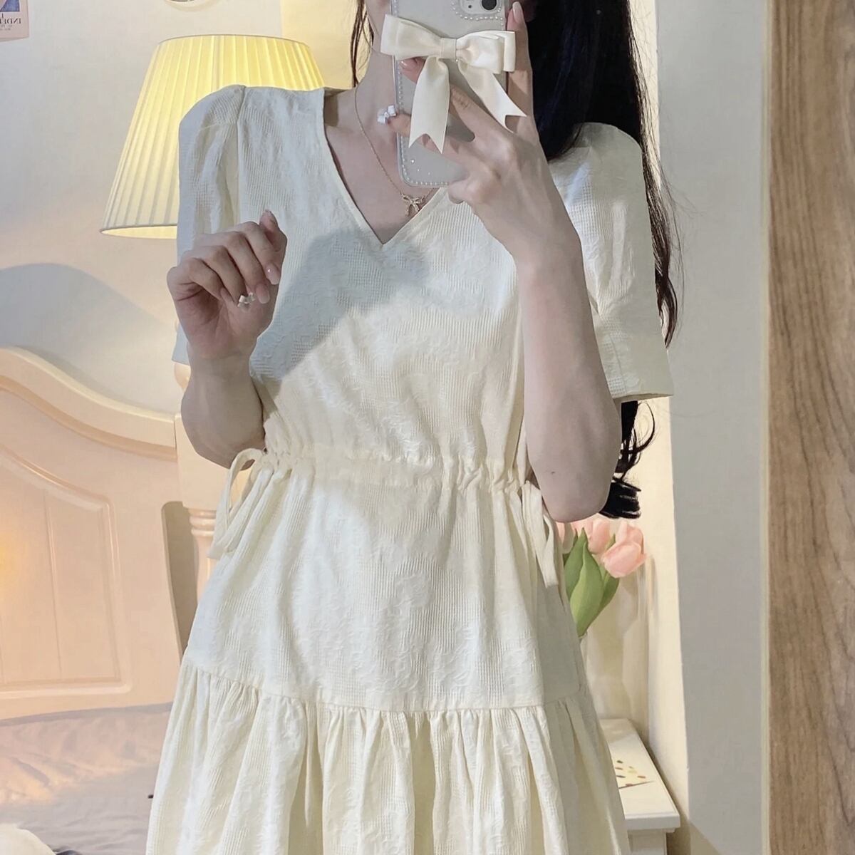 塩辛くて甘いVネックドローストリングウエストスリムフレンチクリームイエロードレス小さな膝丈スカート女性の夏 大人ガーリー スウィート キュート カジュアル サマー 夏物 7460071075435461 | framboise21