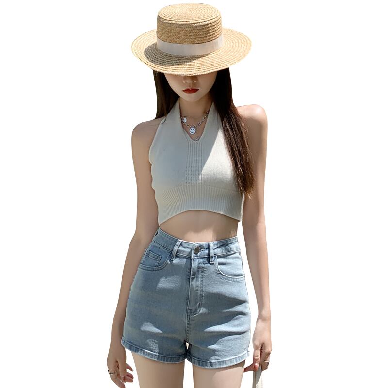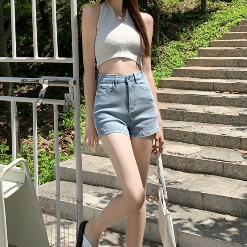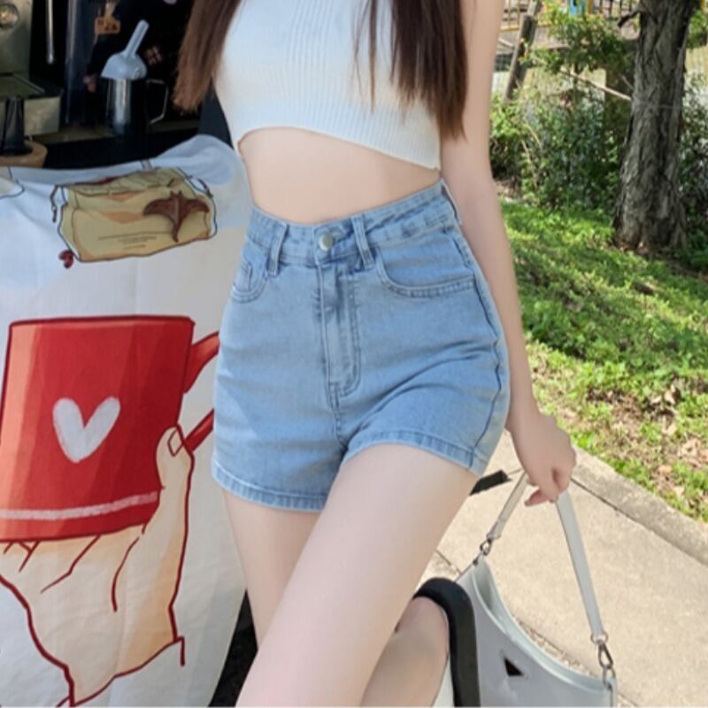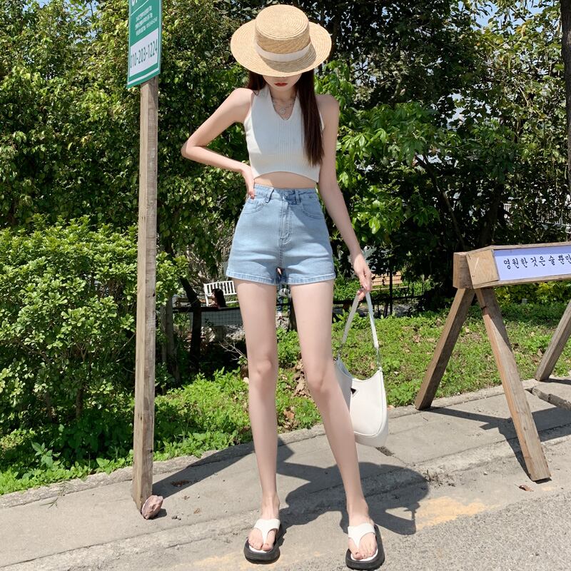 ライトブルーハイウエストデニムスーパーショーツレディースサマーシンセクション2022新作シンエラスティックAラインパンツ ハイウェスト 伸縮 夏物 ブルマー 7460015977003070 | framboise21