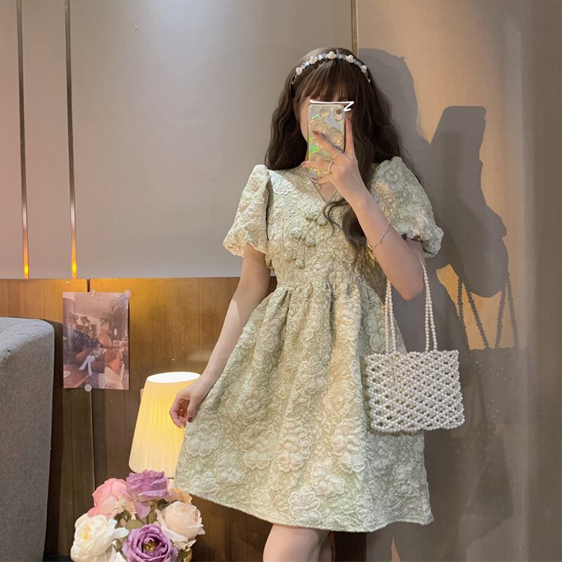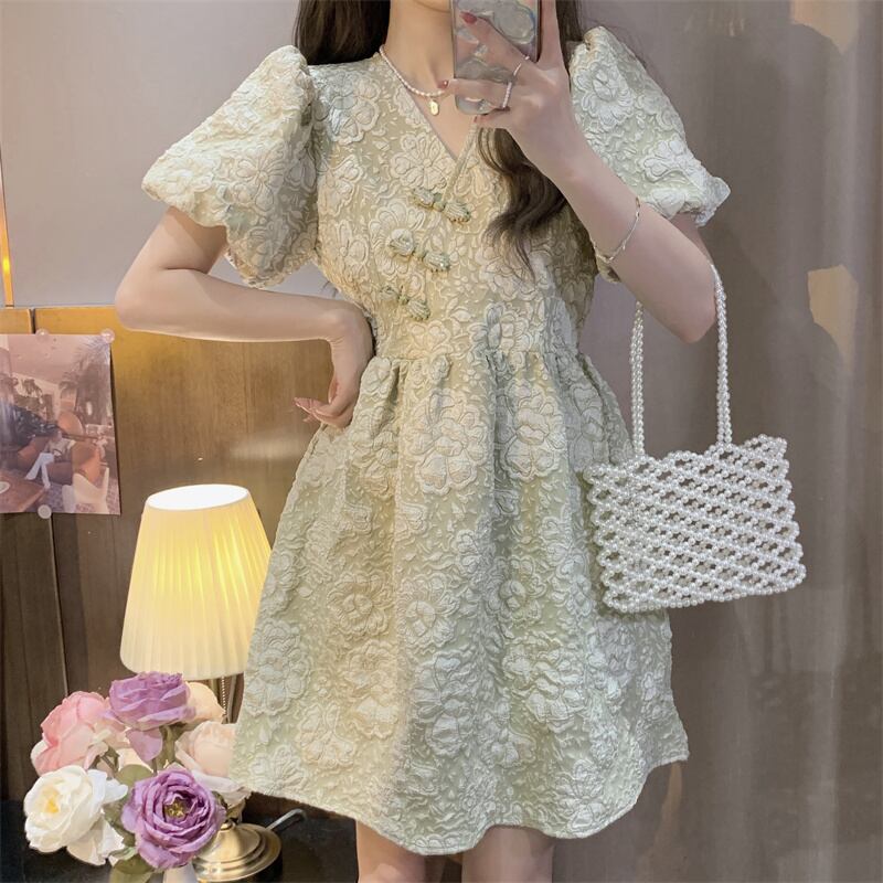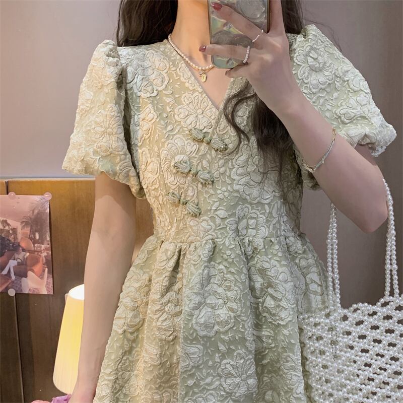 フレンチグリーンフローラルドレス女性サマーミルクスウィートデザイン改良チャイナドレススカートスモールパフスリーブスカート 大人ガーリー キュート カジュアル 夏物 花柄 7460023849667060 | framboise21