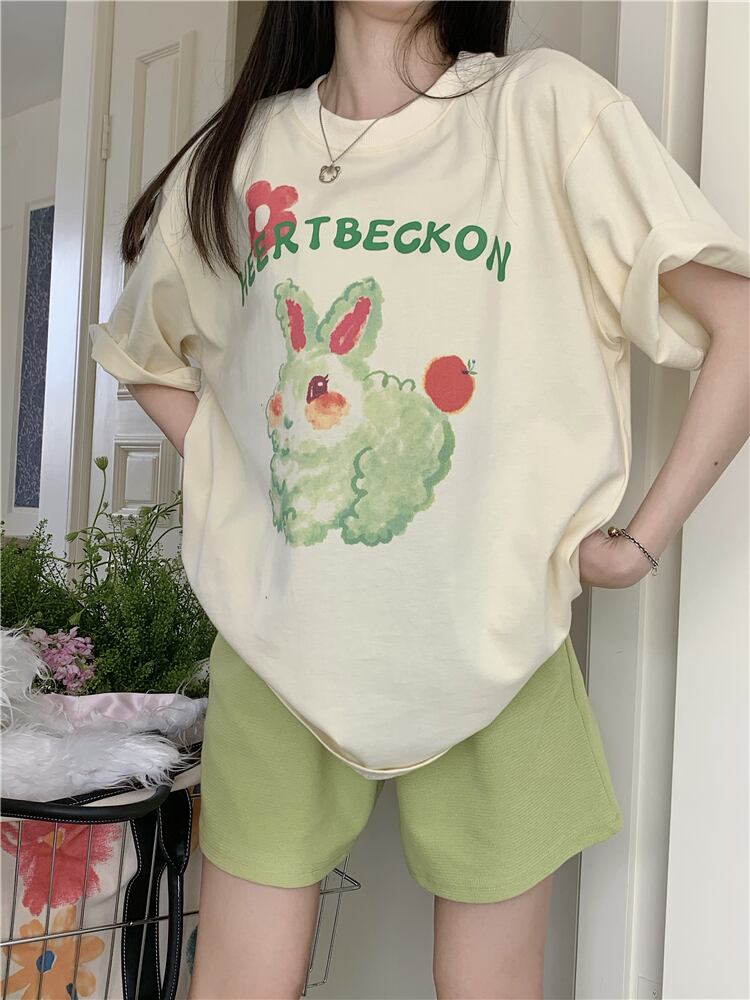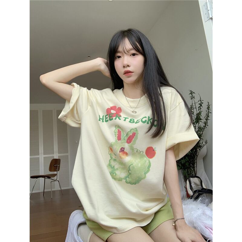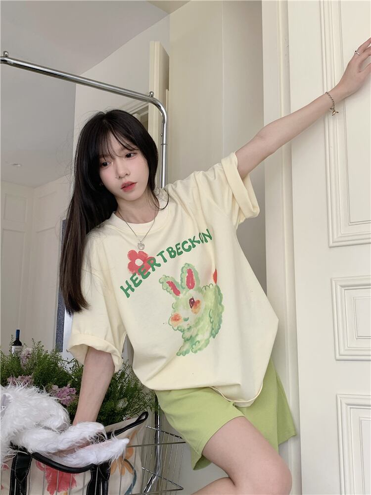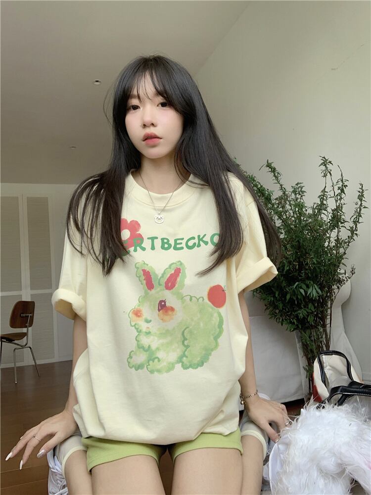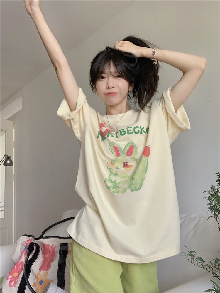 ミルクイエローバニー漫画の手紙印刷半袖Tシャツ女性の夏ルーズかわいい優しい風年齢を減らすトップ 大人ガーリー スウィート キュート カジュアル サマー 夏物 7460046578368701 | framboise21