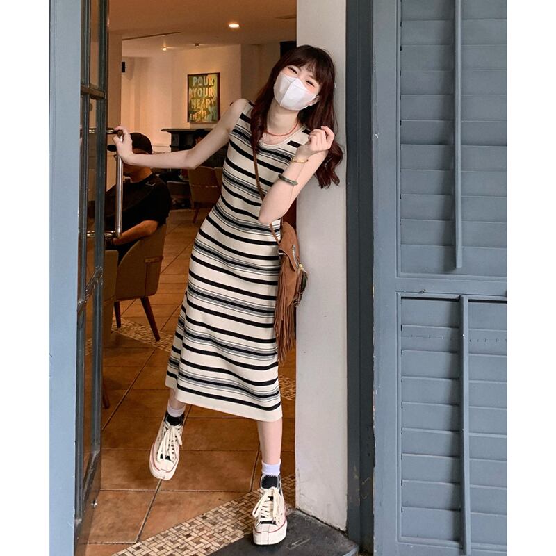 スリングドレスレディースサマー薄手のノースリーブニットスカートスウィートデザインウエストストライプベストロングスカート 大人ガーリー キュート カジュアル 夏物 7460094109819558 | framboise21