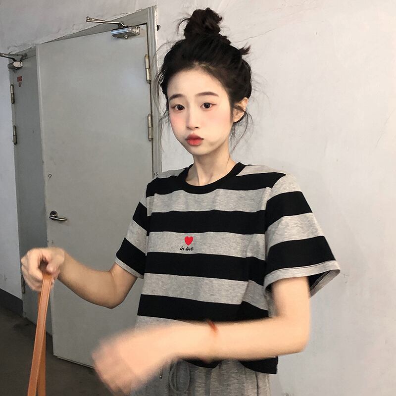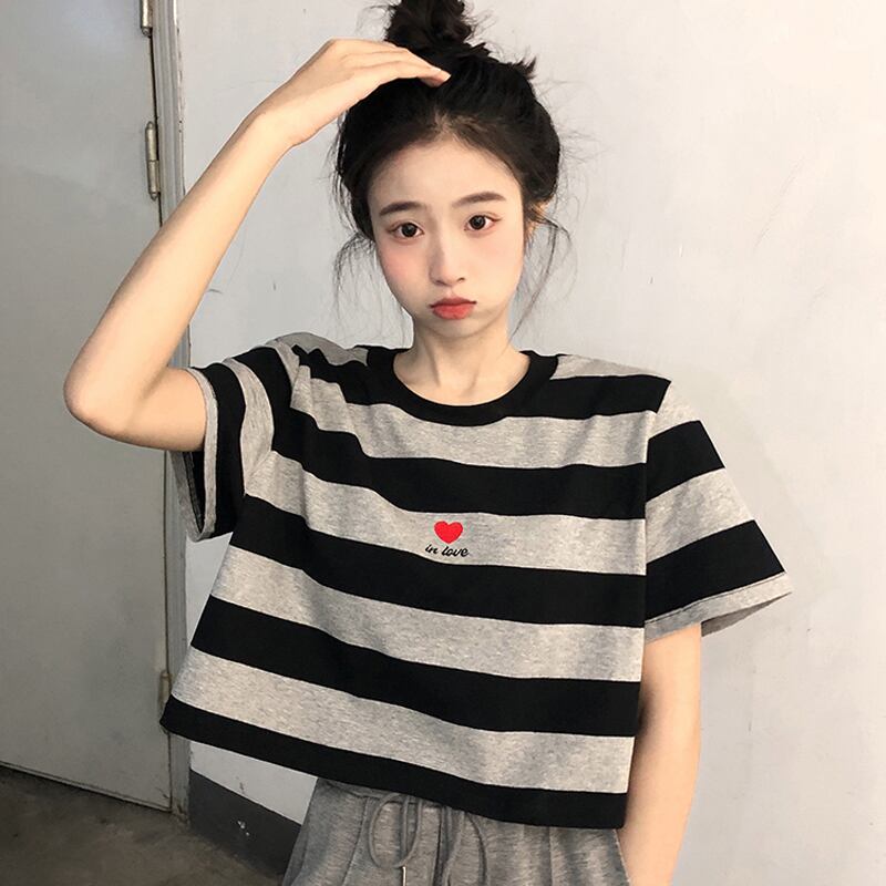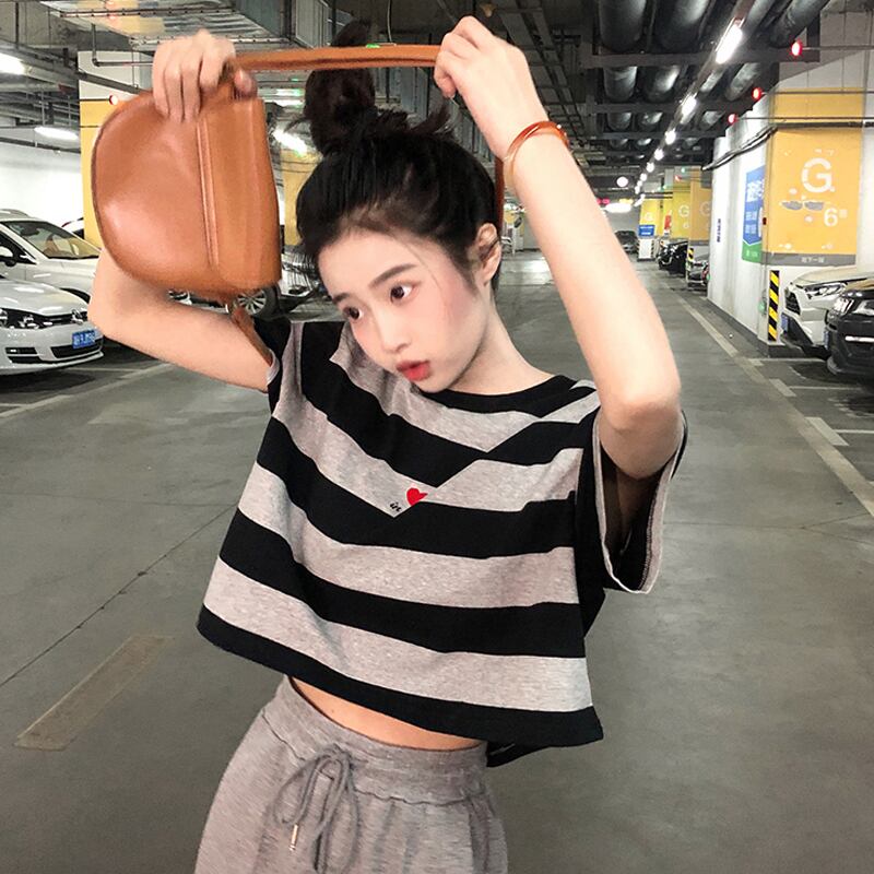 フロントショルダー半袖Tシャツ2022年夏ウィメンズウエストパンツ付きスモールブラックストライプショートトップ ハーフスリーブ サマー 夏物 7460073972110587 | framboise21