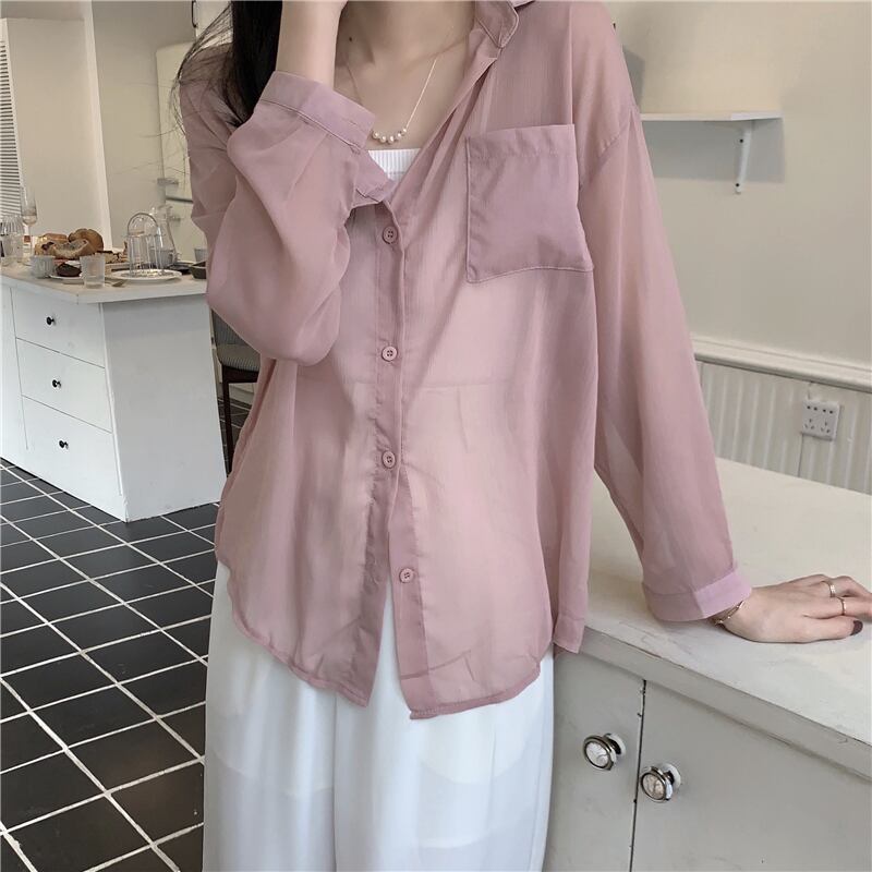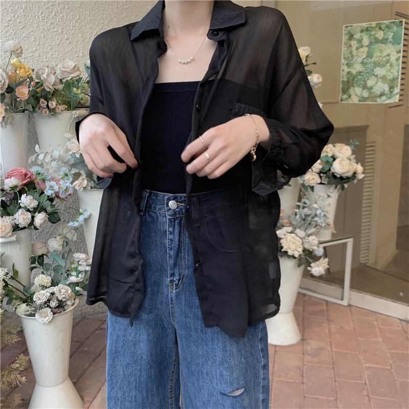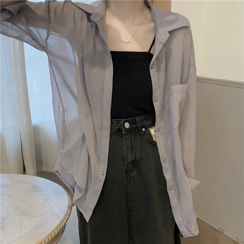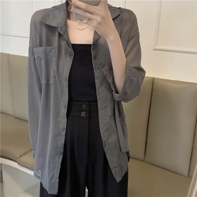 グレーのシフォン日焼け止めシャツの女性の夏のレトロなデザインは、ミドル丈のシャツと薄いコートで外にニッチなサスペンダーを感じます サマー 夏物 7460023850705033 | framboise21
