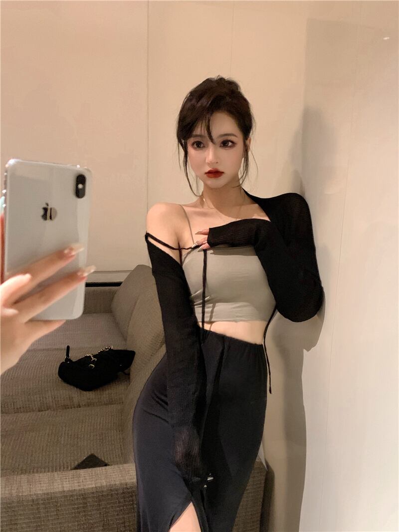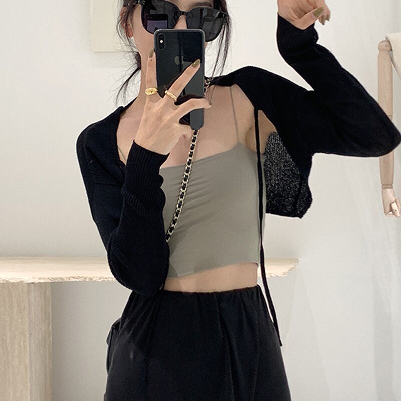 黒の日焼け止めカーディガン女性の夏の薄い小さなチョッキブラウス、サスペンダーと短いハーフレングスのニットショールジャケット ショート ブラック サマー 夏物 7460052955717403 | framboise21