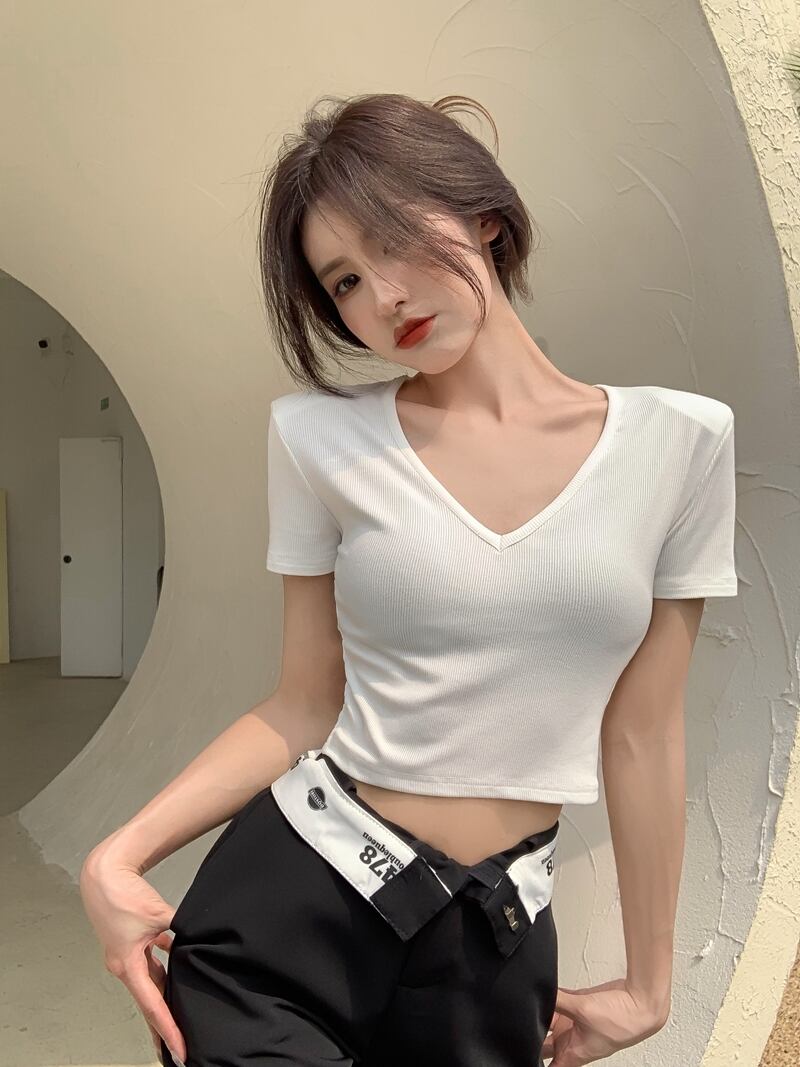 香港スタイルの小さなセクシーなVネック弾性ショルダーパッドコットン半袖Tシャツ女性の夏のインナー鎖骨ボトミングへそトップ エラスティック 伸縮 サマー 夏物 7460057124895937 | framboise21