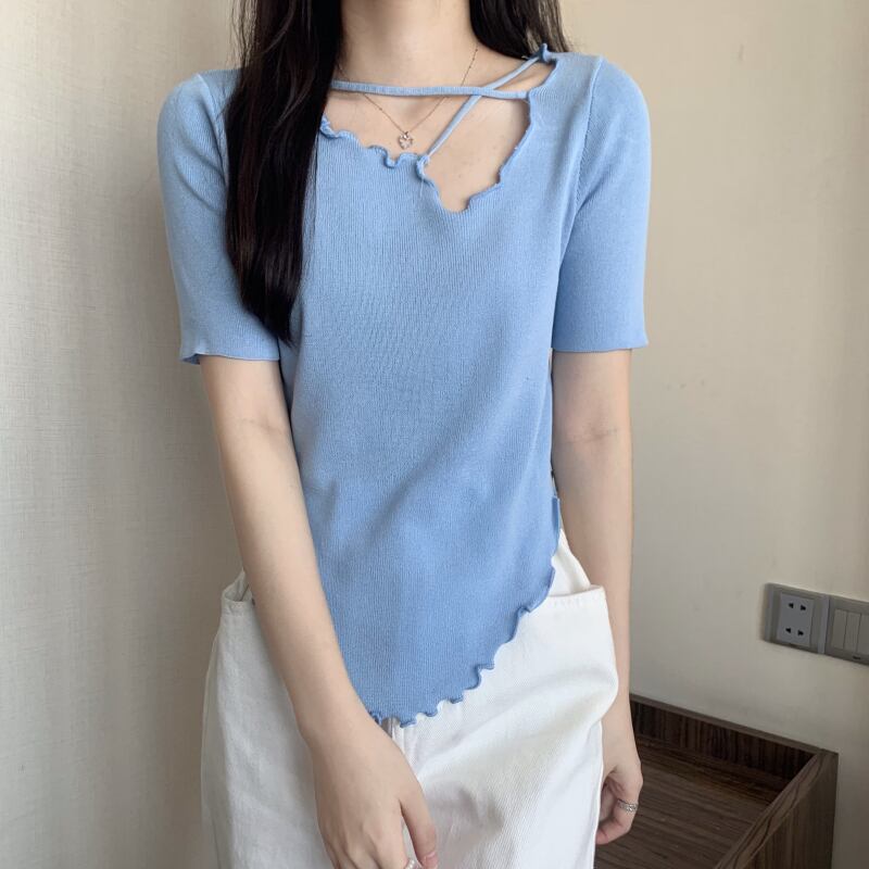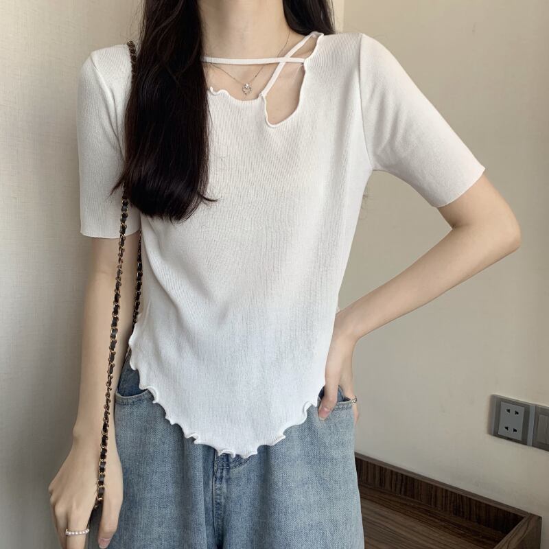 黒の半袖Tシャツ女性の夏の不規則な短いタイトフィットフロントショルダートップ2022新しいアメリカンレトロボトミングシャツ ショート ブラック サマー 夏物 7460089941892895 | framboise21