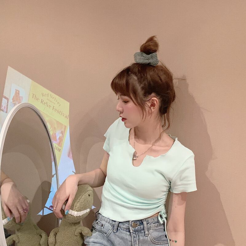 夏のピュアデザイアスタイルのフロントショルダーショートTシャツレディース半袖タイトフィットデザインニッチシックライトパープルクロップトップ サマー 夏物 7460088477276121 | framboise21