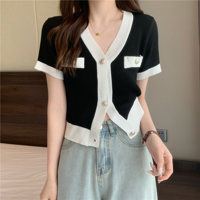 XiaoxiangfengVネックフロントショルダー半袖Tシャツレディースサマーデザインニッチハイウエストショートニットセータートップトレンド ハイウェスト 夏物 7460063666851006 | framboise21