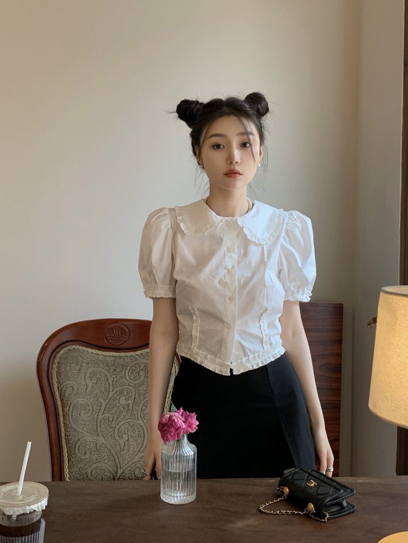ホワイトパフスリーブドールカラーショートシャツレディースサマー半袖シャツデザインセンスニッチスモールシャツシックトップ ハーフスリーブ 夏物 746007065480596 | framboise21