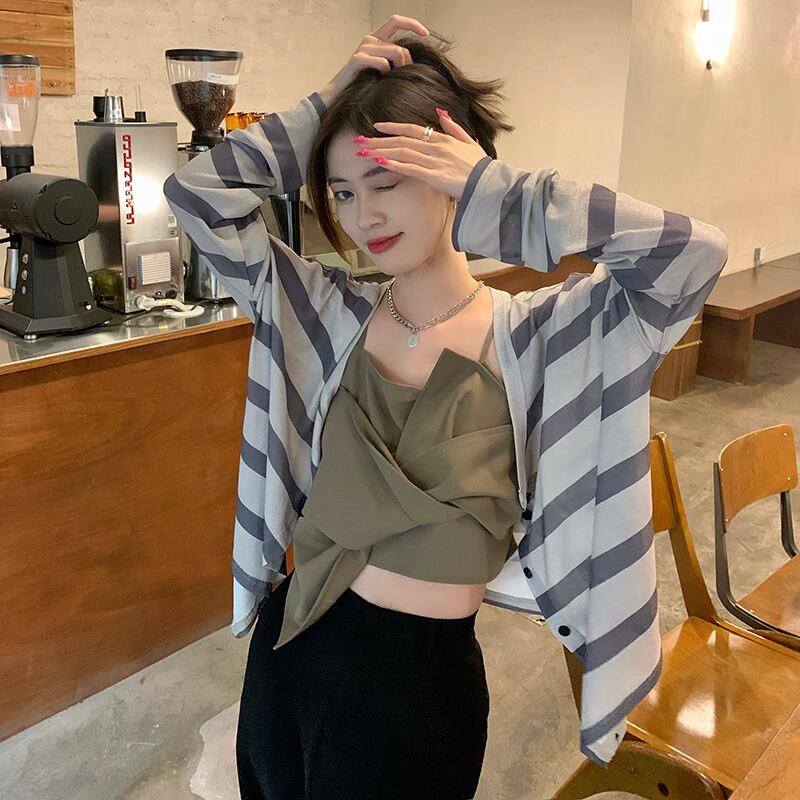 ストライプの薄いショートコート2022年夏の新しい怠惰な風のエアコンシャツルーズな日焼け止めドロップショルダー長袖カーディガン女性 ロング サマー 夏物 7460039034583018 | framboise21