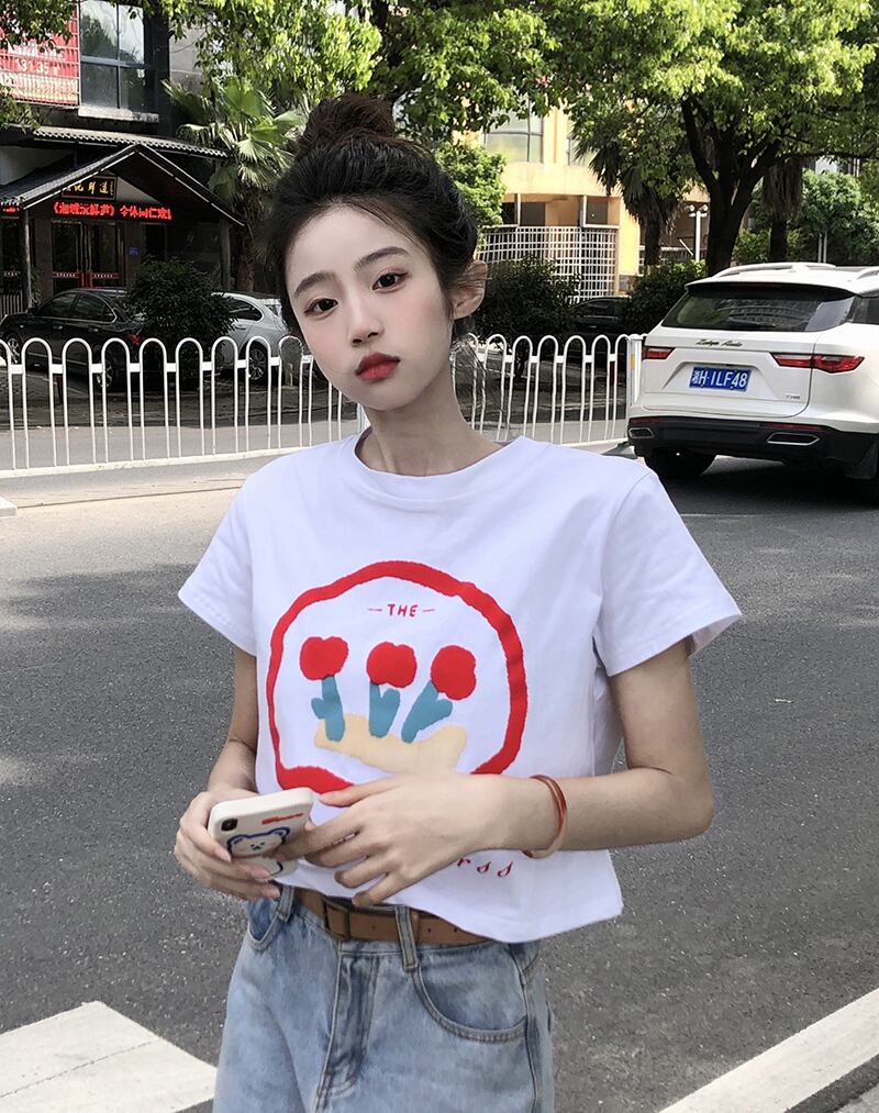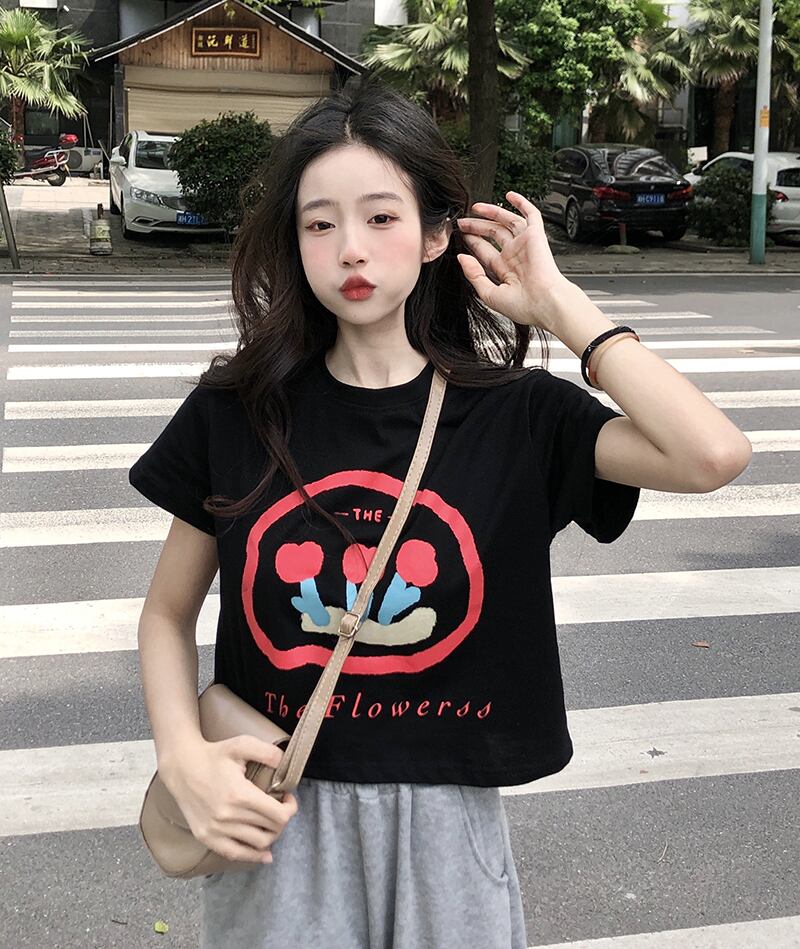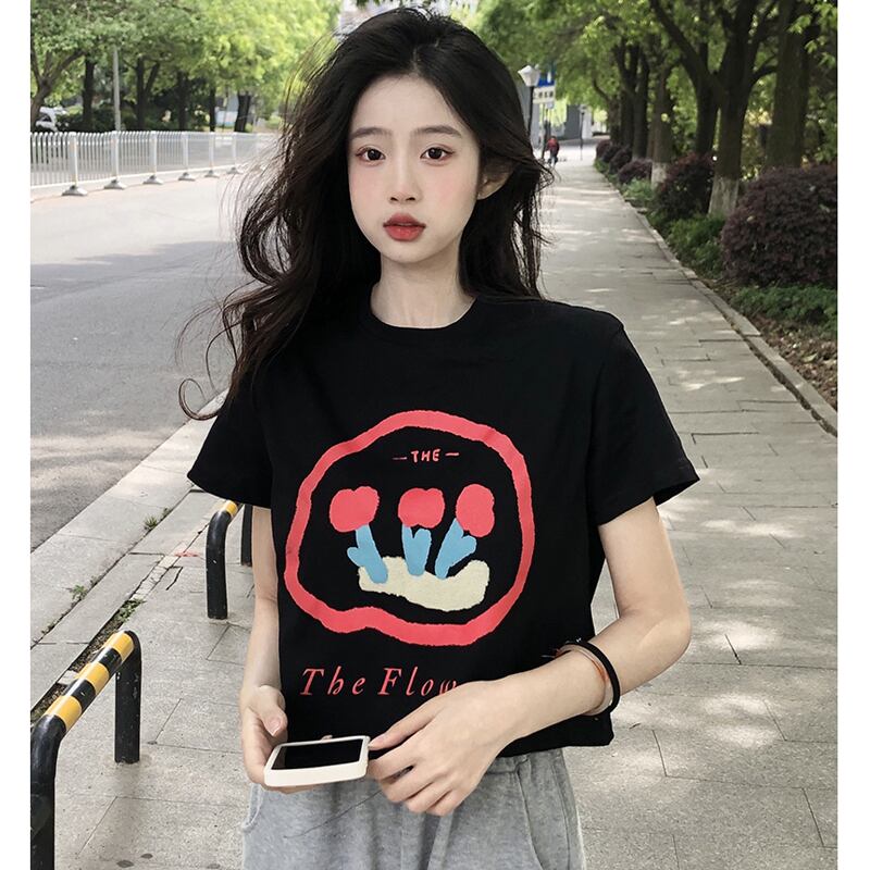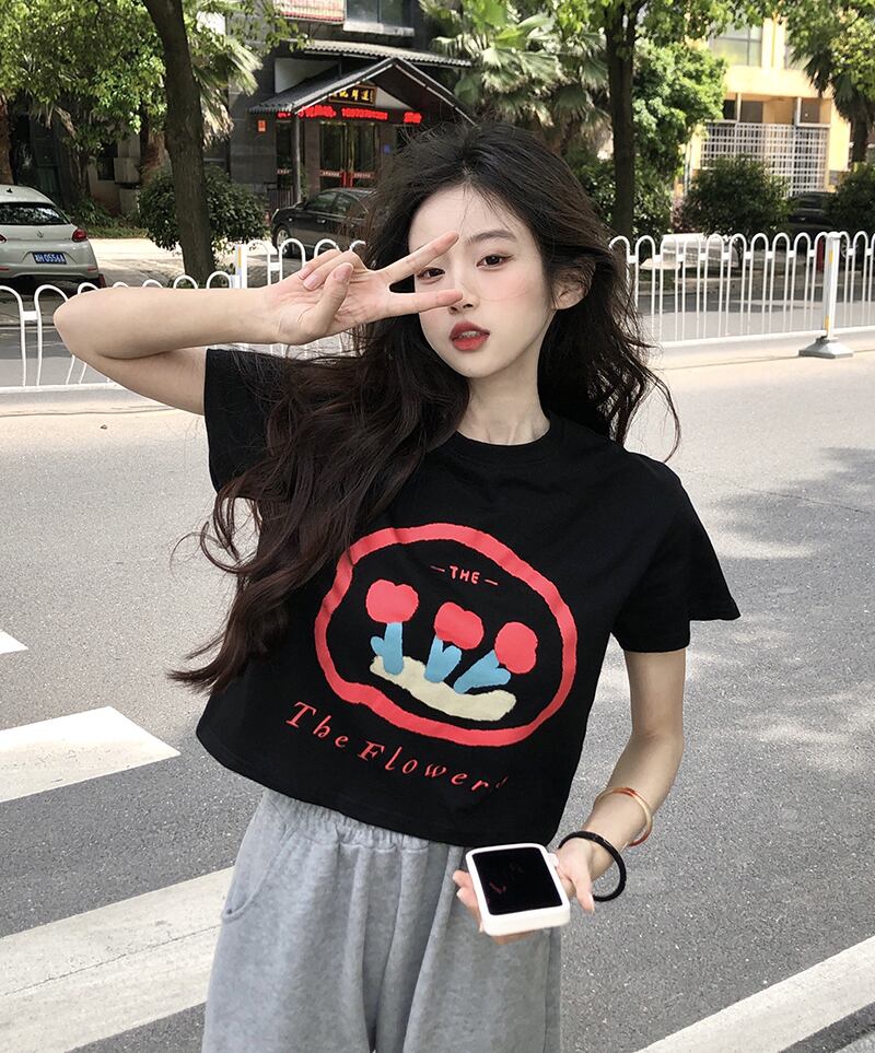 ブラックコットンフロントショルダー半袖Tシャツレディース2022年新夏フラワーグラフィティルーズショートハイウエストトップス ハイウェスト ハーフスリーブ サマー 夏物 フラワーデザイン 7460018931320544 | framboise21