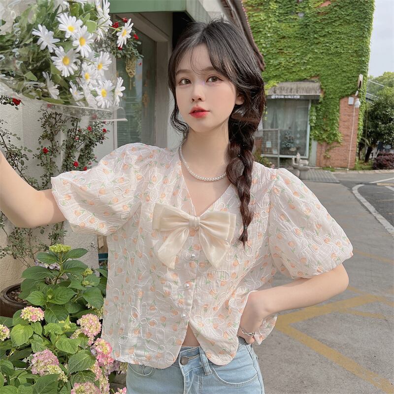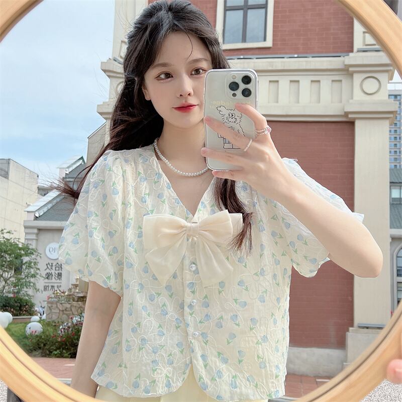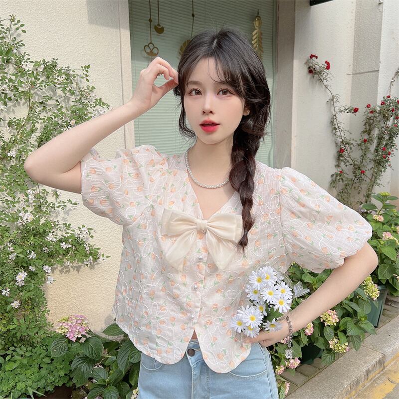 甘くて優しいリボンVネックフローラルシャツレディースデザインニッチフレンチショートパフスリーブトップサマー 大人ガーリー スウィート キュート カジュアル 夏物 花柄 746001819205760 | framboise21