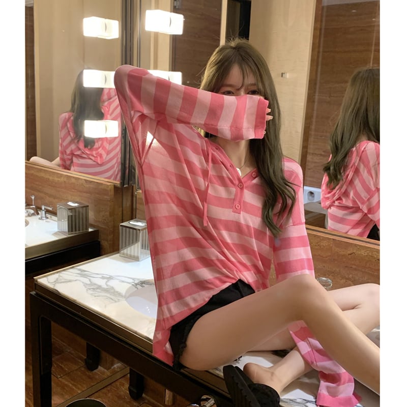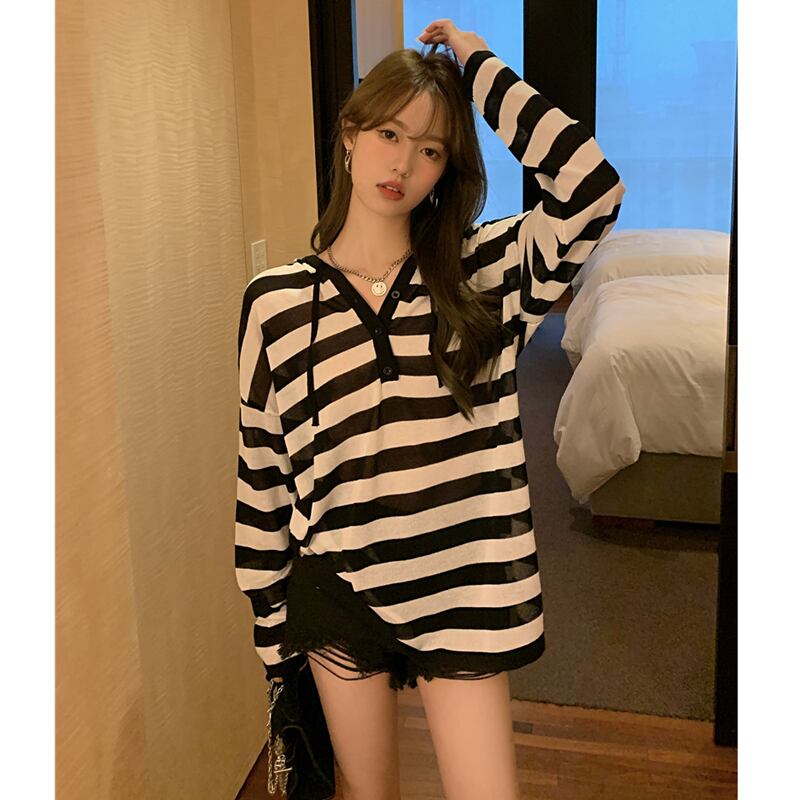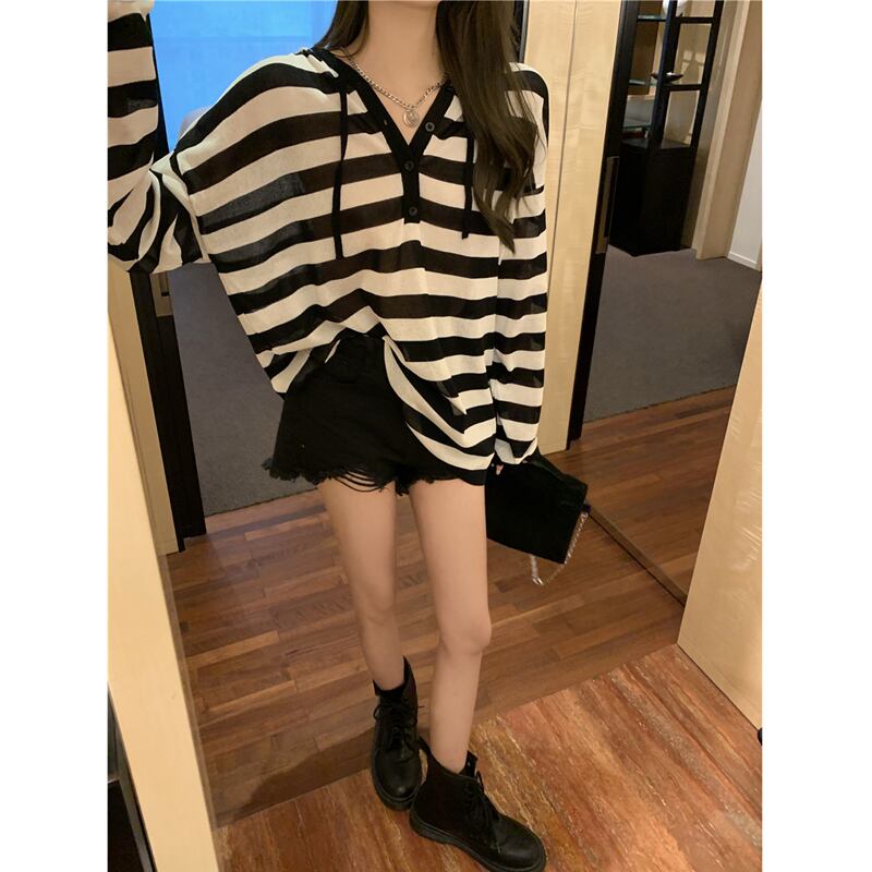 長袖ブラウス黒と白のストライプのTシャツ2022夏の薄いセクションの外側の日焼け止めシャツフード付きシースルートップの女性 ロング ホワイト ブラック サマー 夏物 7460057666395319 | framboise21