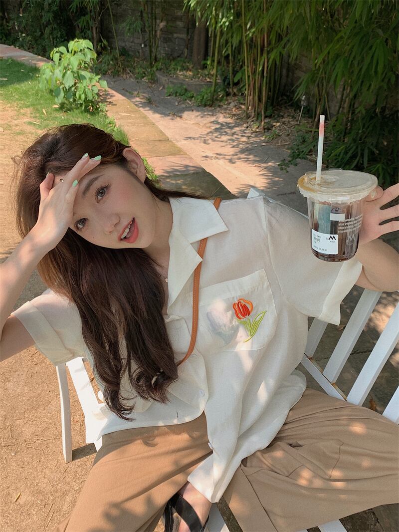 2022年の新しい香港スタイルの半袖刺繍シャツ女性の夏の小さな新鮮なフレンチシックで美しいトップスと小さなデザインセンス レッド サマー 夏物 7460033490277577 | framboise21