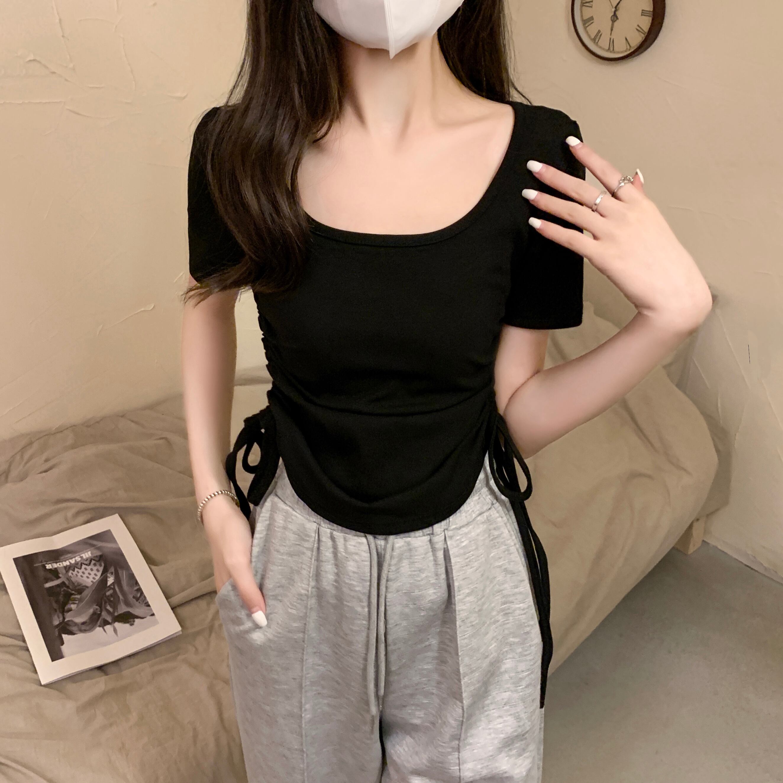ピンクのスクエアネックフロントショルダー半袖Tシャツレディースサマースリムボディシャツショートドローストリングトップデザインニッチ 夏物 スクウェア 746003593106022 | framboise21