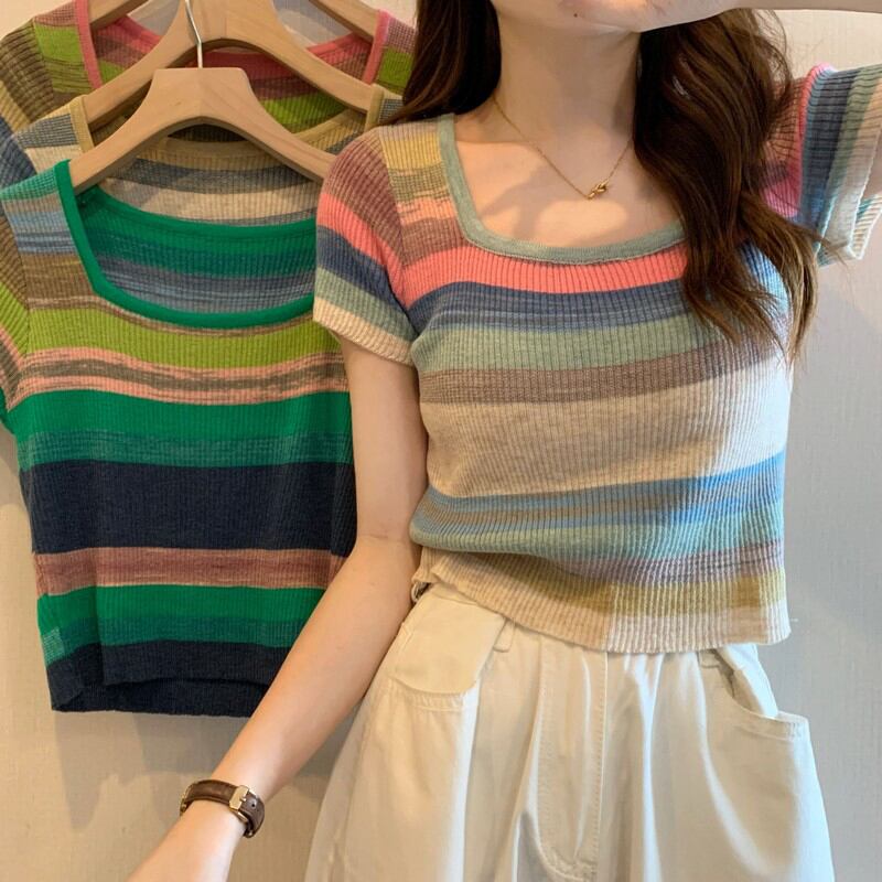 スクエアネックストライプTシャツレディースサマーニットセーター半袖フレンチスモールショートスモールニッチユニークなスペシャルタイトトップ 夏物 スクウェア 7460083554355429 | framboise21