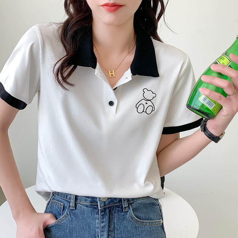 2022年夏のフロントショルダーブラック半袖Tシャツレディースシックなデザインショート刺繍ベアポロカラートップ レッド ハーフスリーブ サマー 夏物 7460085741469040 | framboise21