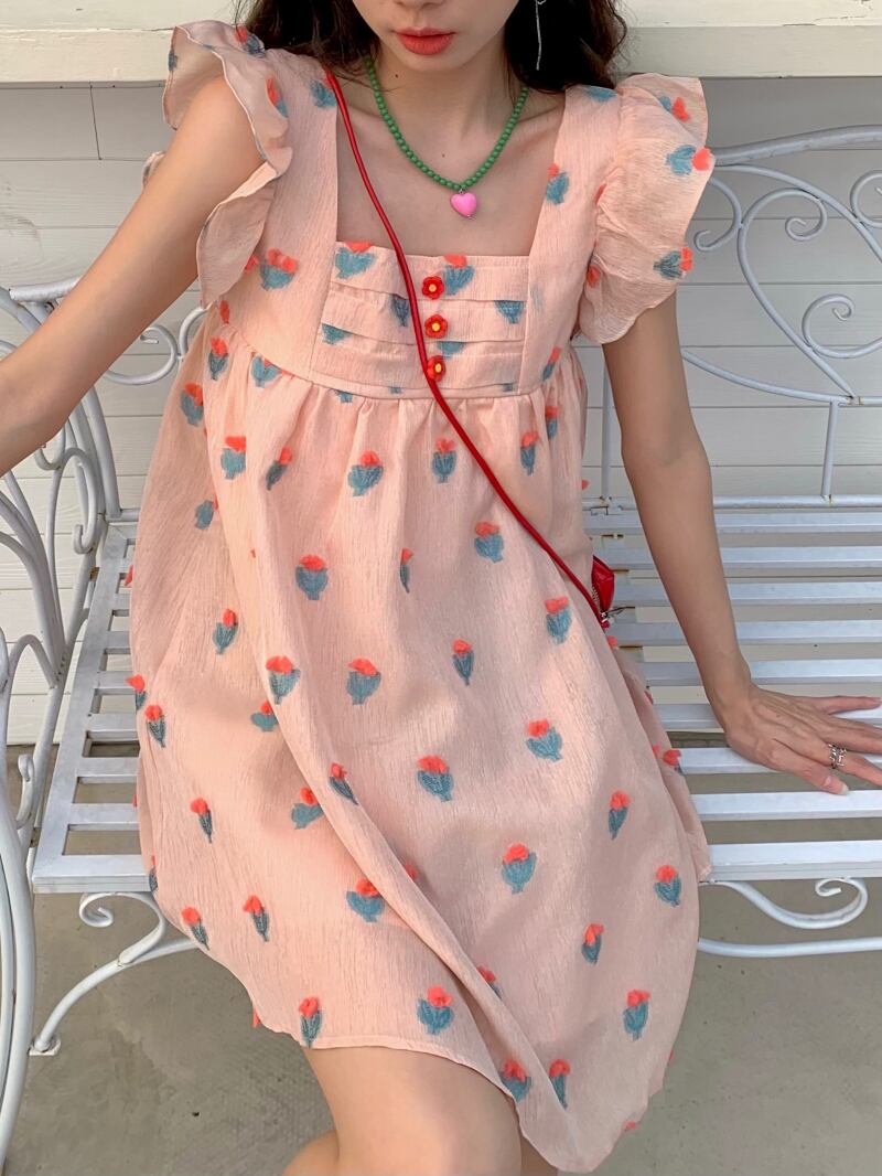 ロータスリーフスリーブスクエアネックフローラルドレス女性夏デザインセンスニッチスウィートフェアリースーパーフェアリーエスト半袖ショートスカート 大人ガーリー キュート カジュアル サマー 夏物 花柄 スクウェア 7460057186806585 | framboise21