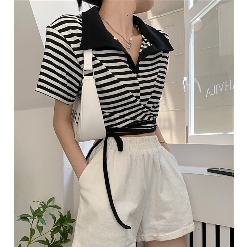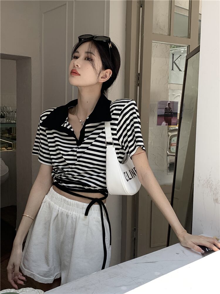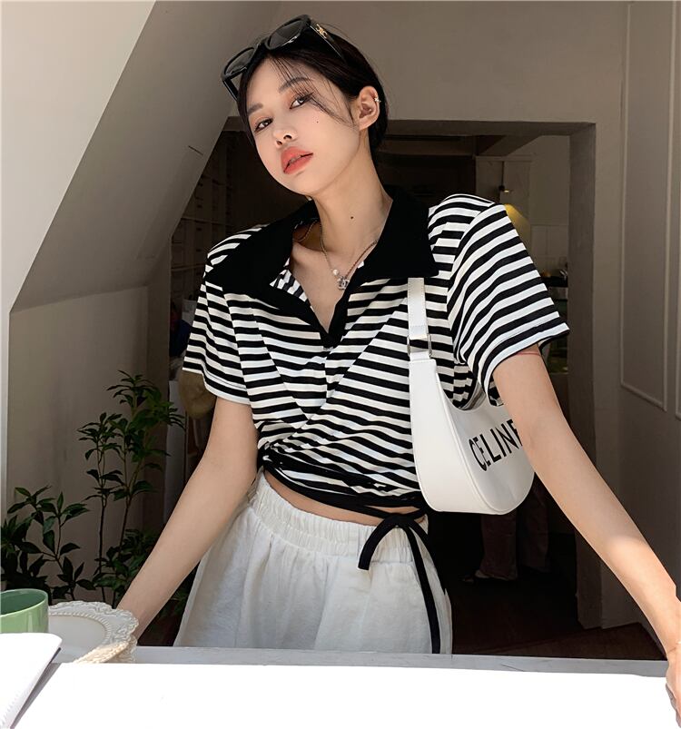 2022年の新しい夏の女性のシックなショートタイロープトップカラーブロックストライプPOLOカラー半袖Tシャツinstide サマー 夏物 7460094305134746 | framboise21