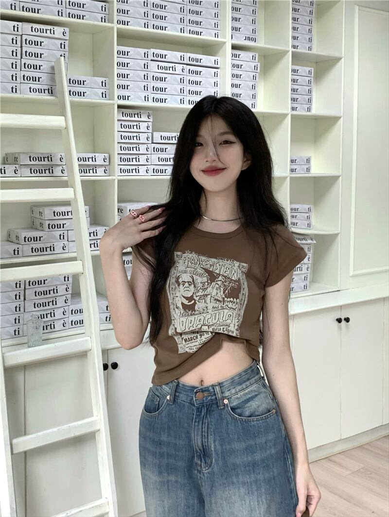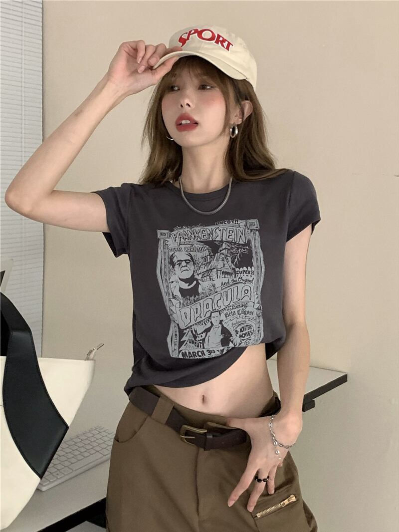 アメリカのレトロなプリント半袖Tシャツ女性の夏夏ショートスリムフィットフロントショルダーコットンヨーロッパとアメリカのハイストリートトップ サマー 夏物 ヨーロピアン 7460081407020923 | framboise21