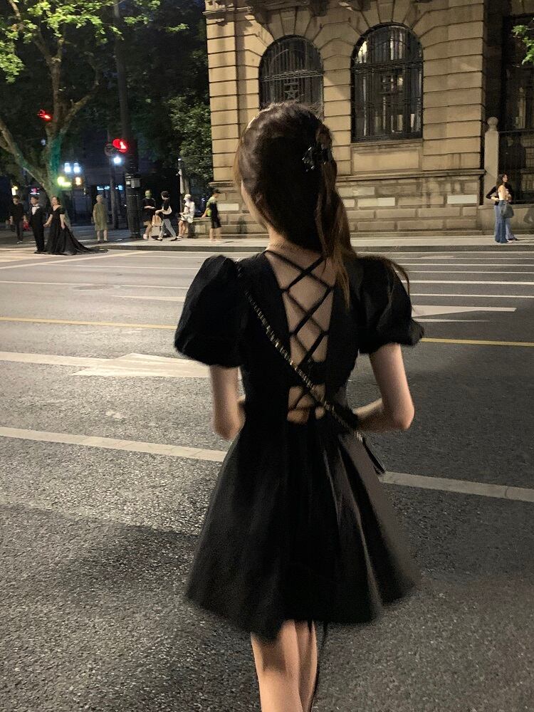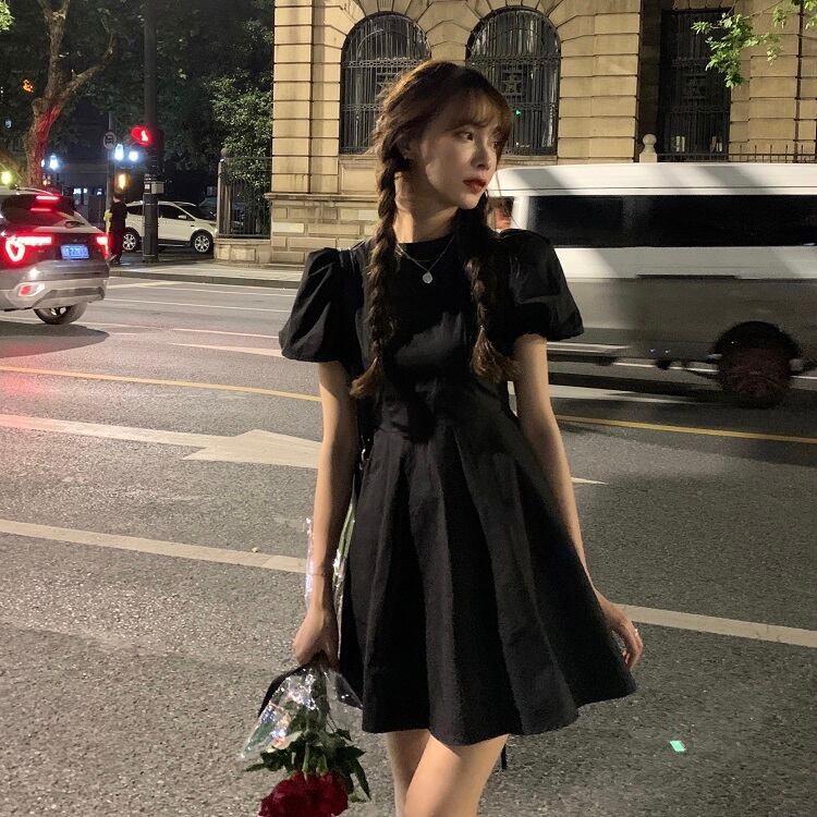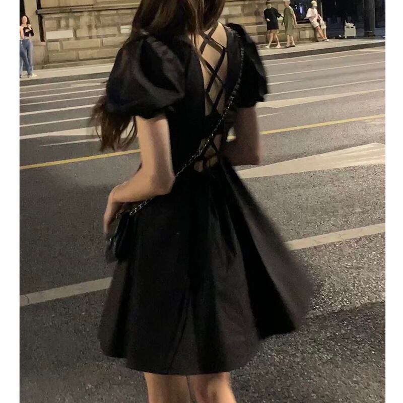 フランスのレトロなパフスリーブドレスデザインセンスニッチ夏女性甘くてスパイシーなウエストスリムヘップバーンスタイルリトルブラックドレス 大人ガーリー スウィート キュート カジュアル サマー 夏物 746002869864860 | framboise21