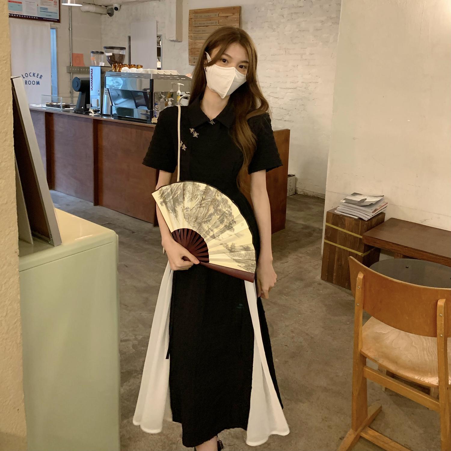 改良されたチャイナドレスナショナルスタイルディスクボタン半袖黒ドレス女性サマースカートニッチデザインレトロウエストミドル丈スカート ブラック 夏物 7460060659518265 | framboise21