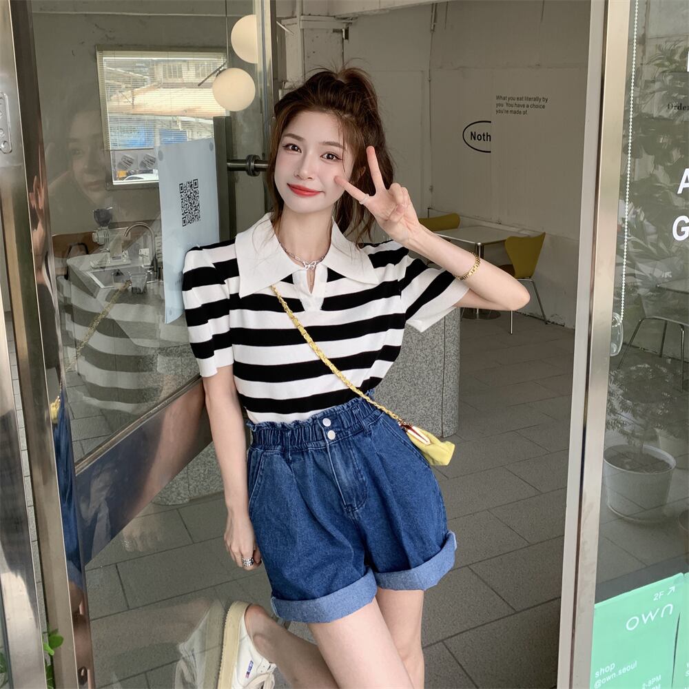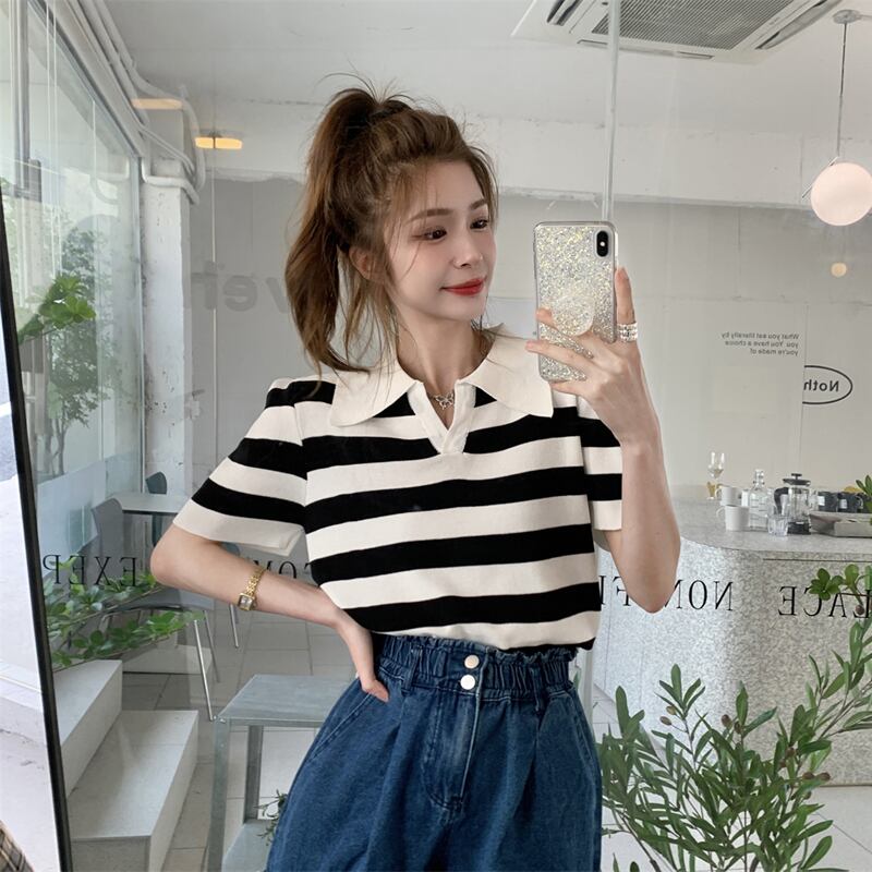 ポロカラー白黒ストライプ半袖Tシャツレディースデザインセンスニッチサマーショートルーズオールマッチトップシャツインタイド ホワイト ブラック 夏物 7460087529182655 | framboise21